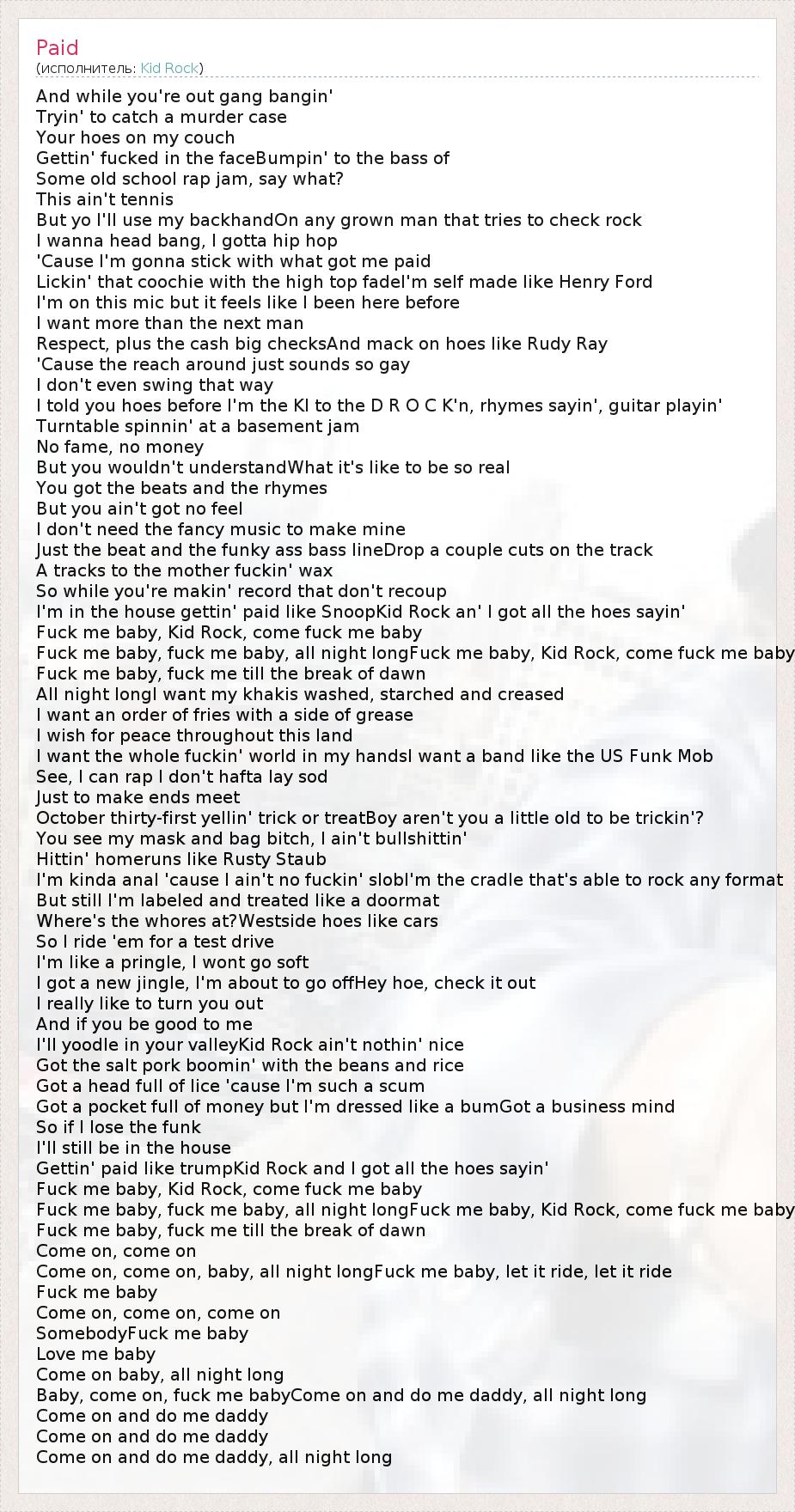 Fuck me baby, fuck me baby, all night longFuck me baby, Kid Rock, come fuck me baby