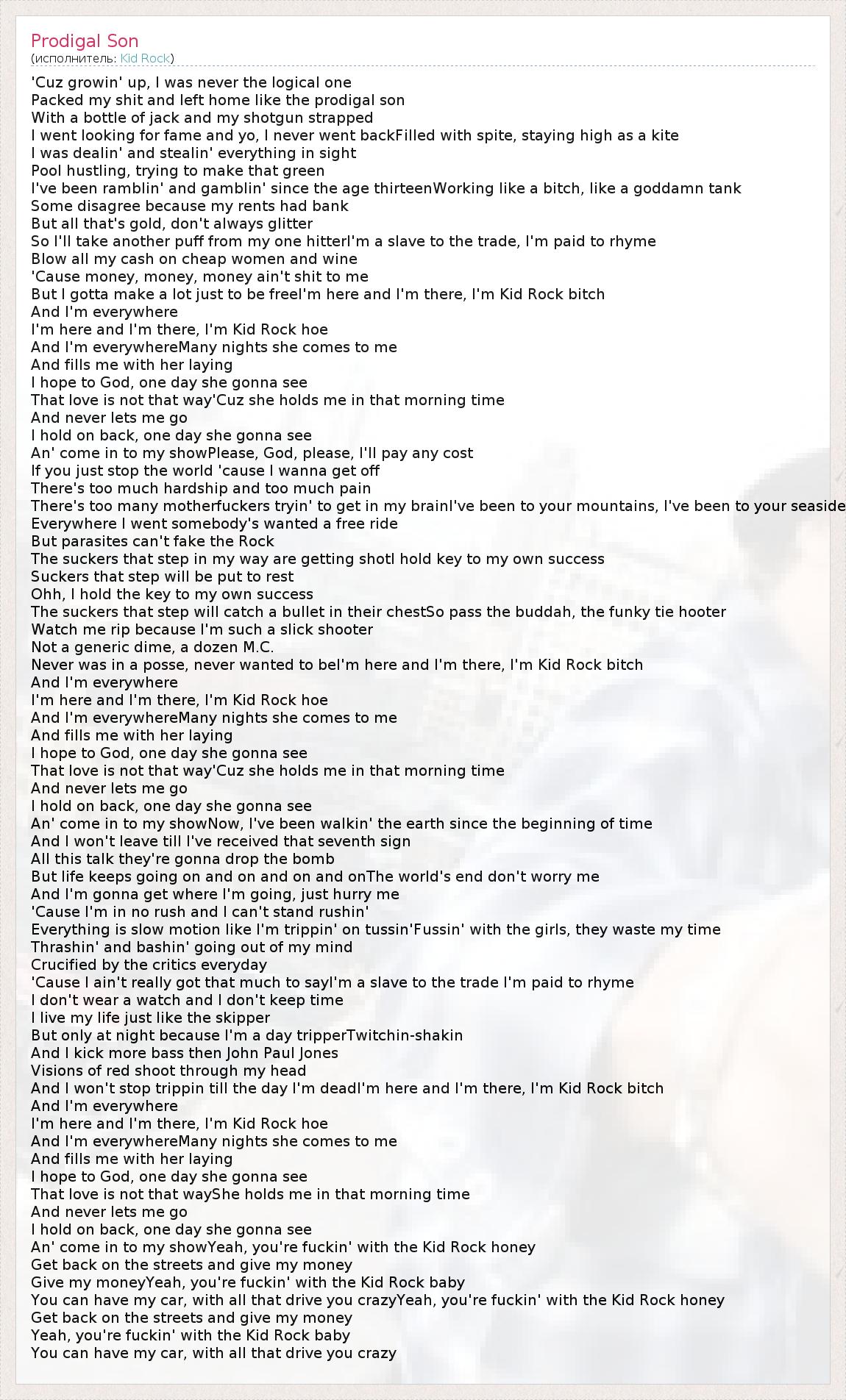Это интересно:Роберт Джеймс Ричи, выступающий под сценическим псевдонимом Kid Rock, родился 17 января 1971 года в городе Ромео, штат Мичиган. Свое первое демо он записал в 1988 году, будучи под влиянием работы группы Beastie Boys "Licensed To Ill". В конце 80-х Kid Rock подписал контракт с фирмой Jive Records, которая в 1990 году выпустила его дебютный альбом "Sandwiches for Breakfast". Песня "Yodelin' in the Valley" с этого... продолжение