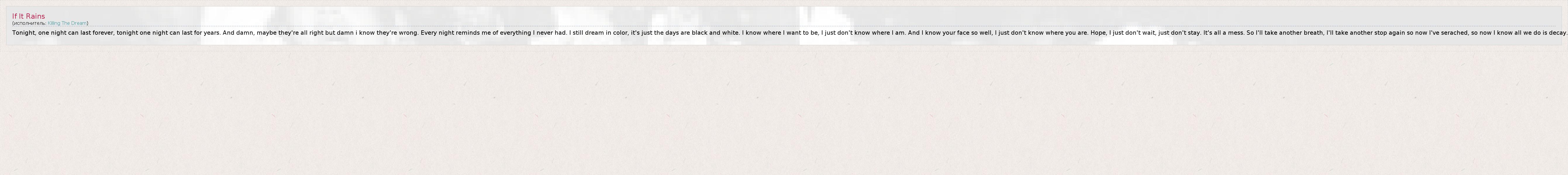 Tonight, one night can last forever, tonight one night can last for years. And damn, maybe they're all right but damn i know they're wrong. Every night reminds me of everything I never had. I still dream in color, it's just the days are black and white. I know where I want to be, I just don't know where I am. And I know your face so well, I just don't know where you are. Hope, I just don't wait, just don't stay. It's all a mess. So I'll take another breath, I'll take another stop again so now I've serached, so now I know all we do is decay.