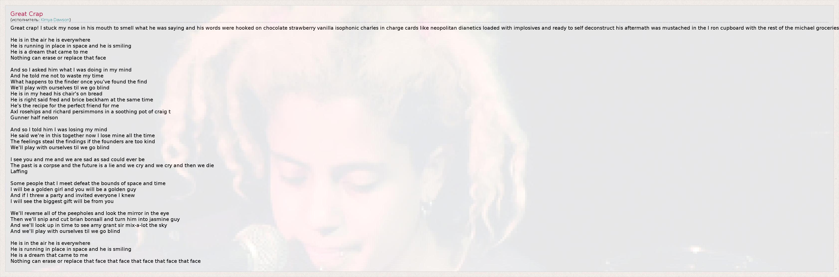 Это интересно:Kimya Dawson родилась 1972 в США. Играет в стиле antifolk. участница группы Moldy Peaches.