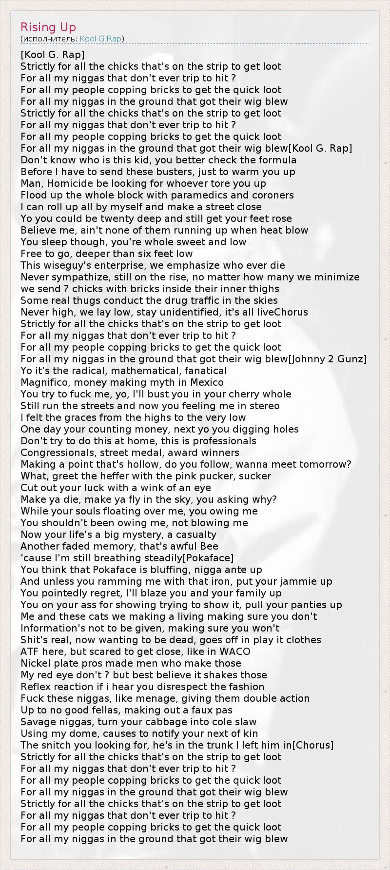 [Kool G. Rap] Strictly for all the chicks that's on the strip to get loot For all my niggas that don't ever trip to hit ? For all my people copping bricks to get the quick loot For all my niggas in the ground that got their wig blew Strictly for all the chicks that's on the strip to get loot For all my niggas that don't ever trip to hit ? For all my people copping bricks to get the quick loot For all my niggas in the ground that got their wig blew[Kool G. Rap] Don't know who is this kid, you better check the formula Before I have to send these busters, just to warm you up Man, Homicide be looking for whoever tore you up Flood up the whole block with paramedics and coroners I can roll up all by myself and make a street close Yo you could be twenty deep and still get your feet rose Believe me, ain't none of them running up when heat blow You sleep though, you're whole sweet and low Free to go, deeper than six feet low This wiseguy's enterprise, we emphasize who ever die Never sympathize, still on the rise, no matter how many we minimize we send ? chicks with bricks inside their inner thighs Some real thugs conduct the drug traffic in the skies Never high, we lay low, stay unidentified, it's all liveChorus Strictly for all the chicks that's on the strip to get loot For all my niggas that don't ever trip to hit ? For all my people copping bricks to get the quick loot For all my niggas in the ground that got their wig blew[Johnny 2 Gunz] Yo it's the radical, mathematical, fanatical Magnifico, money making myth in Mexico You try to fuck me, yo, I'll bust you in your cherry whole Still run the streets and now you feeling me in stereo I felt the graces from the highs to the very low One day your counting money, next yo you digging holes Don't try to do this at home, this is professionals Congressionals, street medal, award winners Making a point that's hollow, do you follow, wanna meet tomorrow? What, greet the heffer with the pink pucker, sucker Cut out your luck with a wink of an eye Make ya die, make ya fly in the sky, you asking why? While your souls floating over me, you owing me You shouldn't been owing me, not blowing me Now your life's a big mystery, a casualty Another faded memory, that's awful Bee 'cause I'm still breathing steadily[Pokaface] You think that Pokaface is bluffing, nigga ante up And unless you ramming me with that iron, put your jammie up You pointedly regret, I'll blaze you and your family up You on your ass for showing trying to show it, pull your panties up Me and these cats we making a living making sure you don't Information's not to be given, making sure you won't Shit's real, now wanting to be dead, goes off in play it clothes ATF here, but scared to get close, like in WACO Nickel plate pros made men who make those My red eye don't ? but best believe it shakes those Reflex reaction if i hear you disrespect the fashion Fuck these niggas, like menage, giving them double action Up to no good fellas, making out a faux pas Savage niggas, turn your cabbage into cole slaw Using my dome, causes to notify your next of kin The snitch you looking for, he's in the trunk I left him in[Chorus] Strictly for all the chicks that's on the strip to get loot For all my niggas that don't ever trip to hit ? For all my people copping bricks to get the quick loot For all my niggas in the ground that got their wig blew Strictly for all the chicks that's on the strip to get loot For all my niggas that don't ever trip to hit ? For all my people copping bricks to get the quick loot For all my niggas in the ground that got their wig blew