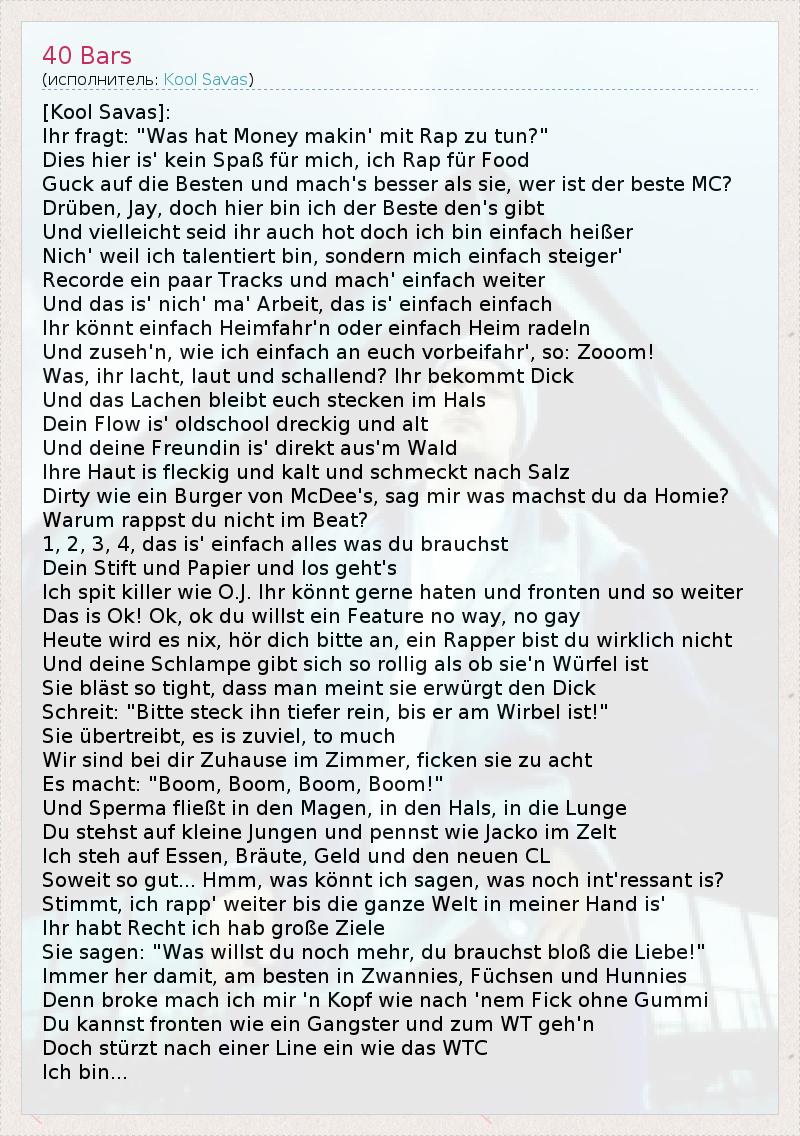 Это интересно:Kool Savas родился 10 февраля 1975 года в Аахене настоящее имя Savas Yurderi- это немецкий рэппер турецкого происхождения.Отец родом из Турции. в 1987 году они перебрались в Берлин.Карьера для этого рэппера началась с песни Warum rappst du? Дальше публика могла услышать его скандально известные песни: “Гомосексуальный рэппер”,“Соси мой *уй” и т.д. До этого момента его можно было услышать под псевдонимом... продолжение