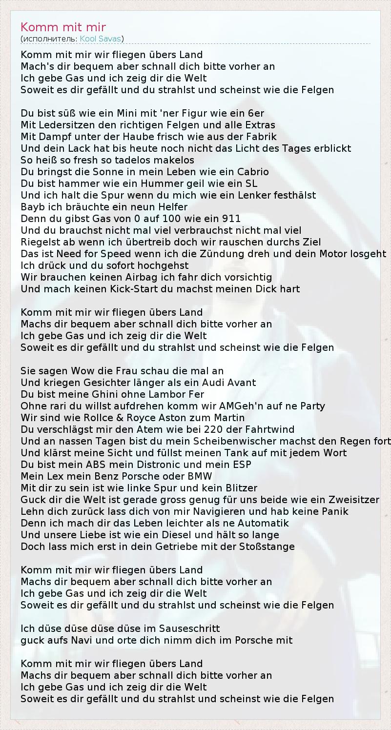 Пойдем со мной, мы будем летать по всей стране Устройтесь поудобнее , но ремень себя заранее на Я даю газ , и я покажу тебе мир Насколько , как вам нравится , и вы блеск и походить оправ Ты милый , как мини есть с фигурой , как 6 С кожаными сиденьями правильные Диски и все дополнительные услуги С силой под капотом как свежий с завода И ваша краска до сих пор не видели дневного света Так горячие так свежие так tadelos makelos Вы приносите солнце в моей жизни как кабриолет Вы молоток как омар роговой как SL И я считаю, трек , когда вы держите меня, как руль Bayb Мне нужно девять помощников Потому что вы даете газ от 0 до 100 , как 911 И вы даже не нужно много даже не потребляют гораздо Riegelst от того, когда я преувеличиваю , но мы спешим через мишень Это Готика когда я включаю зажигание и начинается ваш двигатель Я держу вас и собирается немедленно Нам не нужно сумку , я буду внимательно отвезти вас И не надо делатьтолчок вы делаете свой член трудно Пойдем со мной, мы будем летать по всей стране Мах вас , но удобный ремешок себя заранее на Я даю газ , и я покажу тебе мир Насколько , как вам нравится , и вы блеск и походить оправ Говорят Ничего себеженщина, глядя на времен И получить лица больше , чем Audi Avant Ты мой Гини без Lambor Фер Без Rari вы хотите , чтобы подняться мы приходим на вечеринку AMGeh'n Мы как Rollce & Ройс Aston Martin для Вы verschlägst мое дыхание как при 220ветра И в дождливые дни вы мои дворники покончить дождь И klärst мой взгляд и заполнить мой танк на каждом слове Ты мой ABS моя Distronic и моя ESP Мой Лекс моя Benz , Porsche или BMW Быть с тобой , как левой полосе и не скоростных камер Только посмотрите , мир достаточно велик для нас обоих как двухместный автомобиль Сядьте поудобнее, расслабьтесь , позвольте мне перейти и не быть паника Потому что я буду делать вашу жизнь проще, чем пе автоматический И наша любовь как дизель и длится до тех пор, Но позвольте мне сначала в ваших передач с бампера Пойдем со мной, мы будем летать по всей стране Мах вас , но удобный ремешок себя заранее на Я даю газ , и я покажу тебе мир Насколько , как вам нравится , и вы блеск и походить оправ Я Насадка Насадка Насадка Насадка в мгновение ока заглянуть на Navi и места, которые вы заботитесь о себе в Porsche с Пойдем со мной, мы будем летать по всей стране Мах вас , но удобный ремешок себя заранее на Я даю газ , и я покажу тебе мир Насколько , как вам нравится , и вы блеск и походить оправ