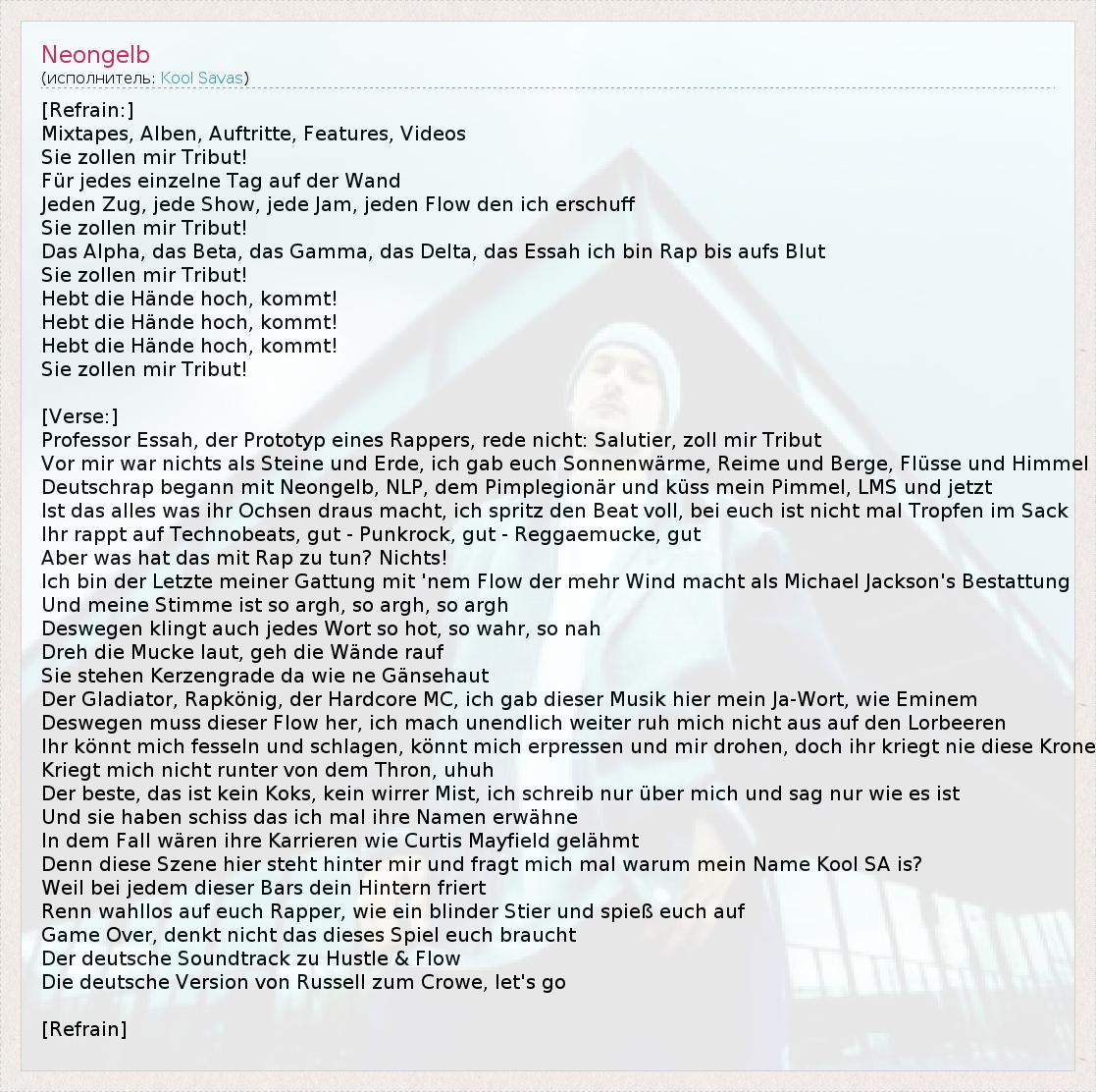 Это интересно:Kool Savas родился 10 февраля 1975 года в Аахене настоящее имя Savas Yurderi- это немецкий рэппер турецкого происхождения.Отец родом из Турции. в 1987 году они перебрались в Берлин.Карьера для этого рэппера началась с песни Warum rappst du? Дальше публика могла услышать его скандально известные песни: “Гомосексуальный рэппер”,“Соси мой *уй” и т.д. До этого момента его можно было услышать под псевдонимом... продолжение