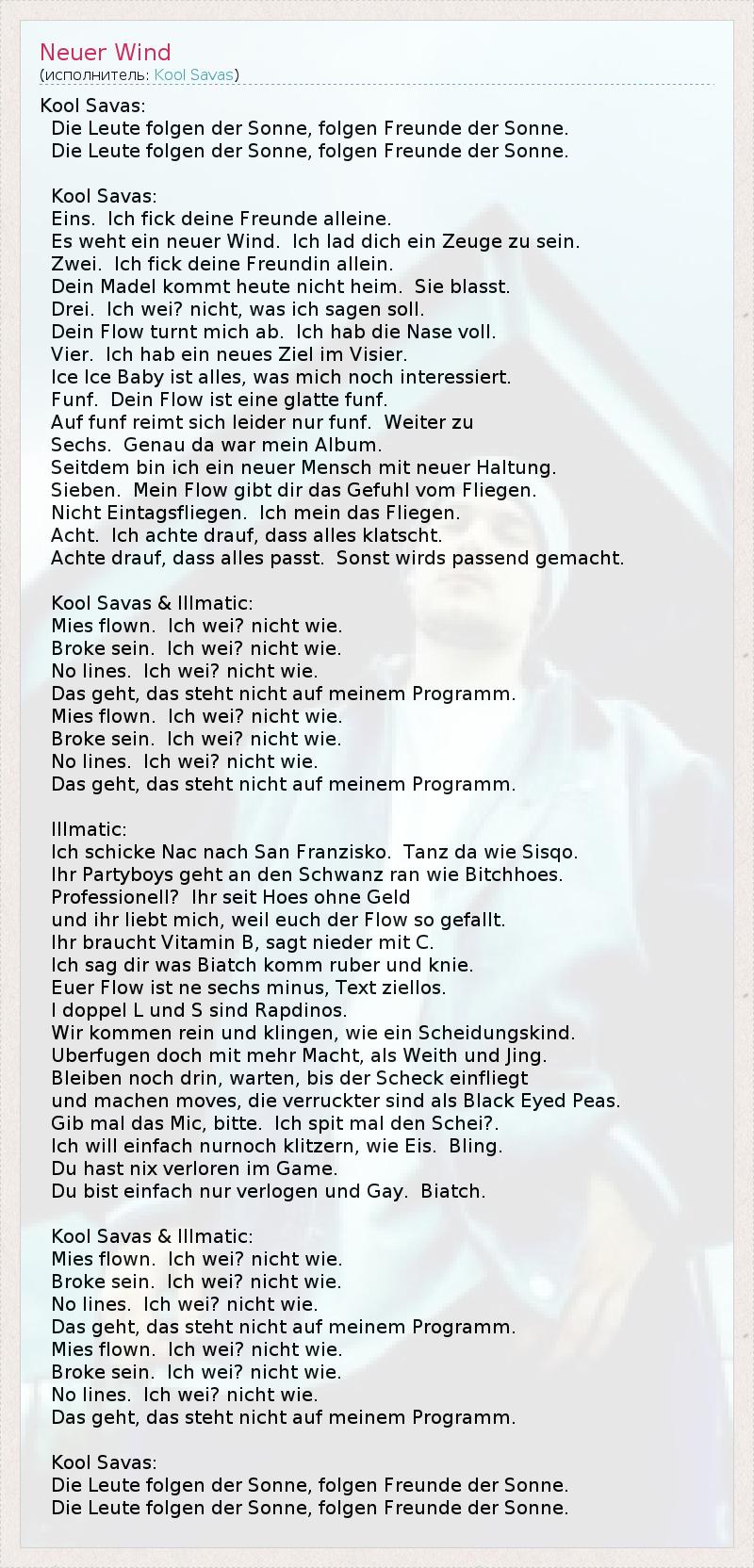 Kool Savas: Die Leute folgen der Sonne, folgen Freunde der Sonne. Die Leute folgen der Sonne, folgen Freunde der Sonne. Kool Savas: Eins. Ich fick deine Freunde alleine. Es weht ein neuer Wind. Ich lad dich ein Zeuge zu sein. Zwei. Ich fick deine Freundin allein. Dein Madel kommt heute nicht heim. Sie blasst. Drei. Ich wei? nicht, was ich sagen soll. Dein Flow turnt mich ab. Ich hab die Nase voll. Vier. Ich hab ein neues Ziel im Visier. Ice Ice Baby ist alles, was mich noch interessiert. Funf. Dein Flow ist eine glatte funf. Auf funf reimt sich leider nur funf. Weiter zu Sechs. Genau da war mein Album. Seitdem bin ich ein neuer Mensch mit neuer Haltung. Sieben. Mein Flow gibt dir das Gefuhl vom Fliegen. Nicht Eintagsfliegen. Ich mein das Fliegen. Acht. Ich achte drauf, dass alles klatscht. Achte drauf, dass alles passt. Sonst wirds passend gemacht. Kool Savas & Illmatic: Mies flown. Ich wei? nicht wie. Broke sein. Ich wei? nicht wie. No lines. Ich wei? nicht wie. Das geht, das steht nicht auf meinem Programm. Mies flown. Ich wei? nicht wie. Broke sein. Ich wei? nicht wie. No lines. Ich wei? nicht wie. Das geht, das steht nicht auf meinem Programm. Illmatic: Ich schicke Nac nach San Franzisko. Tanz da wie Sisqo. Ihr Partyboys geht an den Schwanz ran wie Bitchhoes. Professionell? Ihr seit Hoes ohne Geld und ihr liebt mich, weil euch der Flow so gefallt. Ihr braucht Vitamin B, sagt nieder mit C. Ich sag dir was Biatch komm ruber und knie. Euer Flow ist ne sechs minus, Text ziellos. I doppel L und S sind Rapdinos. Wir kommen rein und klingen, wie ein Scheidungskind. Uberfugen doch mit mehr Macht, als Weith und Jing. Bleiben noch drin, warten, bis der Scheck einfliegt und machen moves, die verruckter sind als Black Eyed Peas. Gib mal das Mic, bitte. Ich spit mal den Schei?. Ich will einfach nurnoch klitzern, wie Eis. Bling. Du hast nix verloren im Game. Du bist einfach nur verlogen und Gay. Biatch. Kool Savas & Illmatic: Mies flown. Ich wei? nicht wie. Broke sein. Ich wei? nicht wie. No lines. Ich wei? nicht wie. Das geht, das steht nicht auf meinem Programm. Mies flown. Ich wei? nicht wie. Broke sein. Ich wei? nicht wie. No lines. Ich wei? nicht wie. Das geht, das steht nicht auf meinem Programm. Kool Savas: Die Leute folgen der Sonne, folgen Freunde der Sonne. Die Leute folgen der Sonne, folgen Freunde der Sonne.