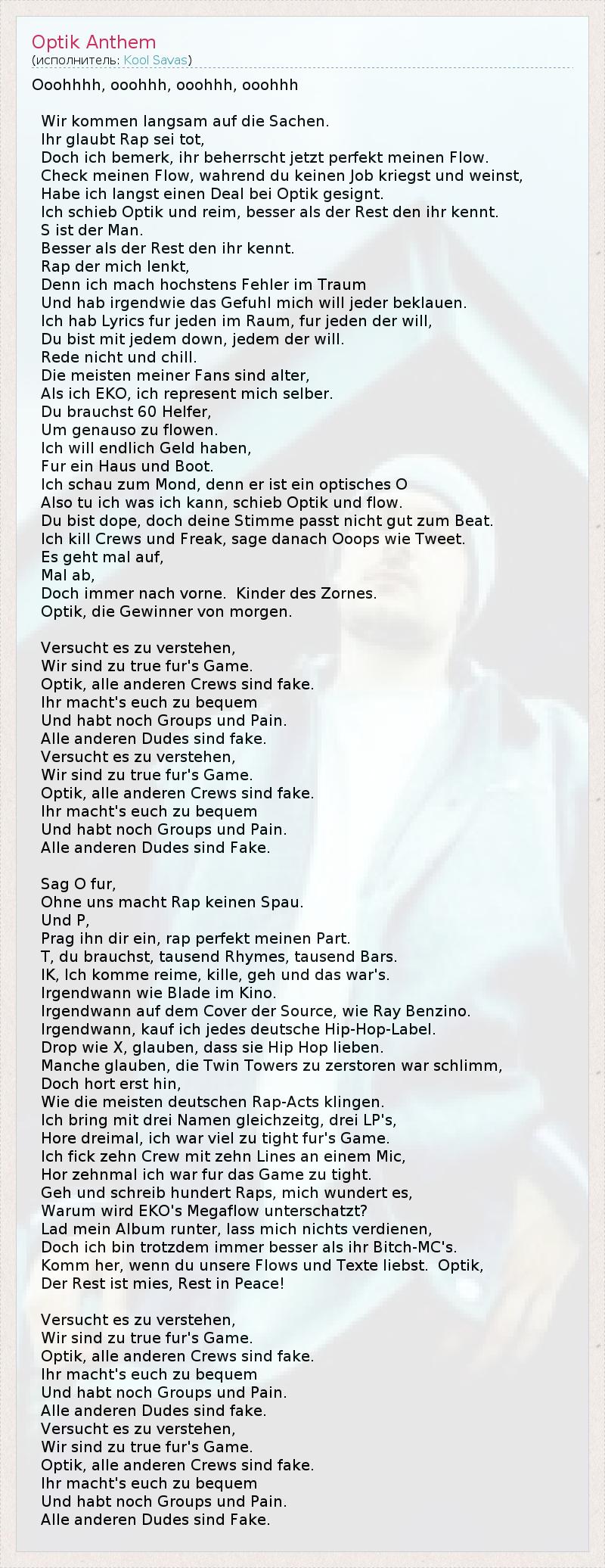 Ooohhhh, ooohhh, ooohhh, ooohhh Wir kommen langsam auf die Sachen. Ihr glaubt Rap sei tot, Doch ich bemerk, ihr beherrscht jetzt perfekt meinen Flow. Check meinen Flow, wahrend du keinen Job kriegst und weinst, Habe ich langst einen Deal bei Optik gesignt. Ich schieb Optik und reim, besser als der Rest den ihr kennt. S ist der Man. Besser als der Rest den ihr kennt. Rap der mich lenkt, Denn ich mach hochstens Fehler im Traum Und hab irgendwie das Gefuhl mich will jeder beklauen. Ich hab Lyrics fur jeden im Raum, fur jeden der will, Du bist mit jedem down, jedem der will. Rede nicht und chill. Die meisten meiner Fans sind alter, Als ich EKO, ich represent mich selber. Du brauchst 60 Helfer, Um genauso zu flowen. Ich will endlich Geld haben, Fur ein Haus und Boot. Ich schau zum Mond, denn er ist ein optisches O Also tu ich was ich kann, schieb Optik und flow. Du bist dope, doch deine Stimme passt nicht gut zum Beat. Ich kill Crews und Freak, sage danach Ooops wie Tweet. Es geht mal auf, Mal ab, Doch immer nach vorne. Kinder des Zornes. Optik, die Gewinner von morgen. Versucht es zu verstehen, Wir sind zu true fur's Game. Optik, alle anderen Crews sind fake. Ihr macht's euch zu bequem Und habt noch Groups und Pain. Alle anderen Dudes sind fake. Versucht es zu verstehen, Wir sind zu true fur's Game. Optik, alle anderen Crews sind fake. Ihr macht's euch zu bequem Und habt noch Groups und Pain. Alle anderen Dudes sind Fake. Sag O fur, Ohne uns macht Rap keinen Spau. Und P, Prag ihn dir ein, rap perfekt meinen Part. T, du brauchst, tausend Rhymes, tausend Bars. IK, Ich komme reime, kille, geh und das war's. Irgendwann wie Blade im Kino. Irgendwann auf dem Cover der Source, wie Ray Benzino. Irgendwann, kauf ich jedes deutsche Hip-Hop-Label. Drop wie X, glauben, dass sie Hip Hop lieben. Manche glauben, die Twin Towers zu zerstoren war schlimm, Doch hort erst hin, Wie die meisten deutschen Rap-Acts klingen. Ich bring mit drei Namen gleichzeitg, drei LP's, Hore dreimal, ich war viel zu tight fur's Game. Ich fick zehn Crew mit zehn Lines an einem Mic, Hor zehnmal ich war fur das Game zu tight. Geh und schreib hundert Raps, mich wundert es, Warum wird EKO's Megaflow unterschatzt? Lad mein Album runter, lass mich nichts verdienen, Doch ich bin trotzdem immer besser als ihr Bitch-MC's. Komm her, wenn du unsere Flows und Texte liebst. Optik, Der Rest ist mies, Rest in Peace! Versucht es zu verstehen, Wir sind zu true fur's Game. Optik, alle anderen Crews sind fake. Ihr macht's euch zu bequem Und habt noch Groups und Pain. Alle anderen Dudes sind fake. Versucht es zu verstehen, Wir sind zu true fur's Game. Optik, alle anderen Crews sind fake. Ihr macht's euch zu bequem Und habt noch Groups und Pain. Alle anderen Dudes sind Fake.
