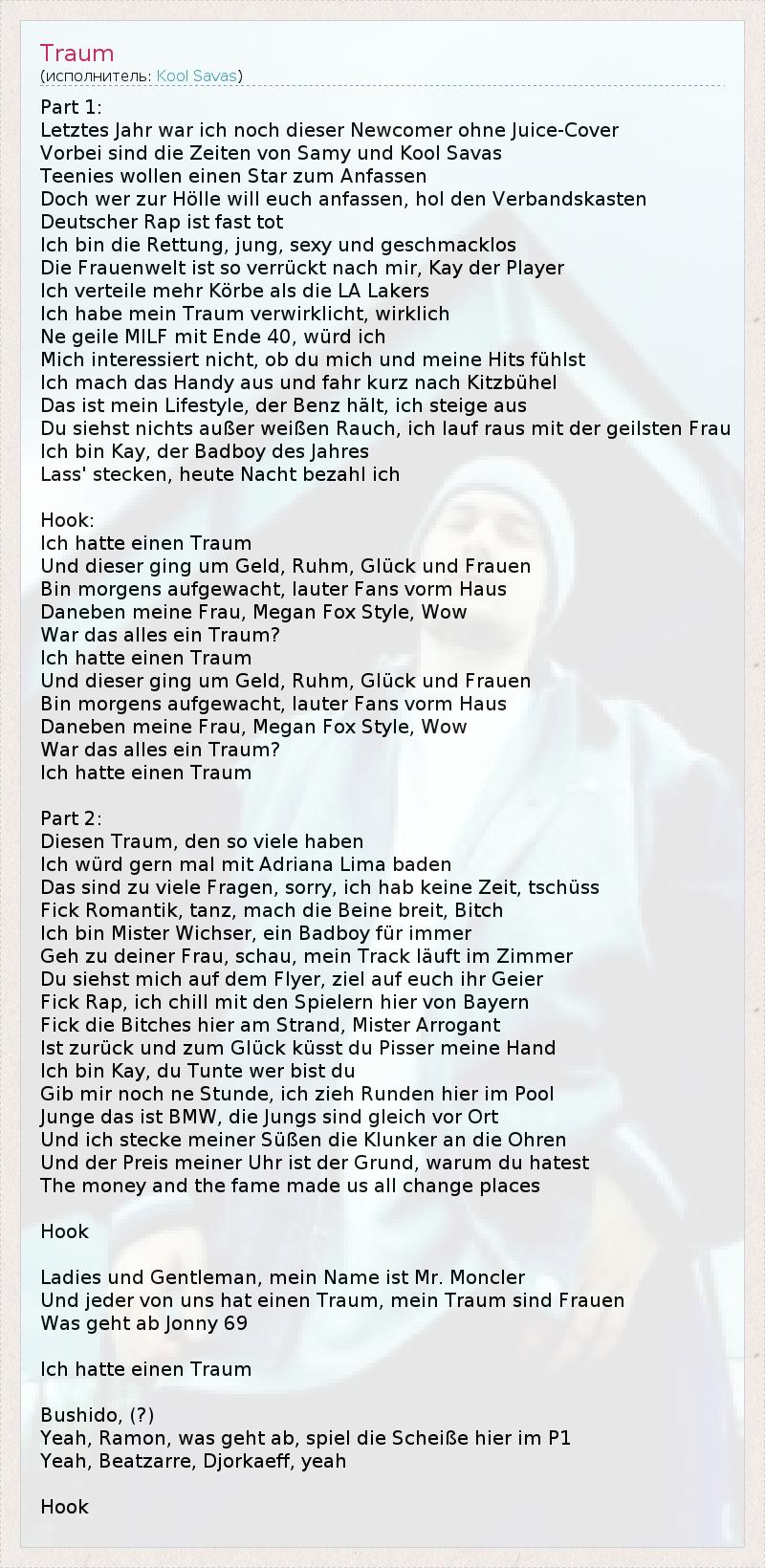 Это интересно:Kool Savas родился 10 февраля 1975 года в Аахене настоящее имя Savas Yurderi- это немецкий рэппер турецкого происхождения.Отец родом из Турции. в 1987 году они перебрались в Берлин.Карьера для этого рэппера началась с песни Warum rappst du? Дальше публика могла услышать его скандально известные песни: “Гомосексуальный рэппер”,“Соси мой *уй” и т.д. До этого момента его можно было услышать под псевдонимом... продолжение