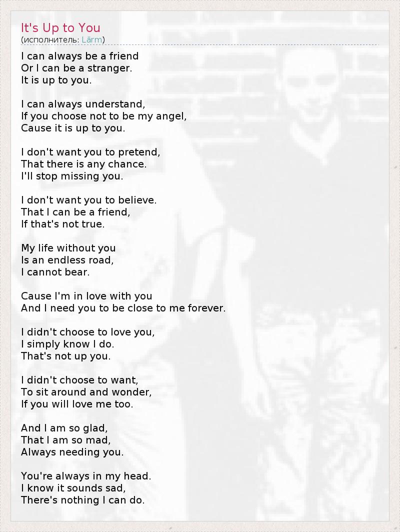 I can always be a friend Or I can be a stranger. It is up to you. I can always understand, If you choose not to be my angel, Cause it is up to you. I don't want you to pretend, That there is any chance. I'll stop missing you. I don't want you to believe. That I can be a friend, If that's not true. My life without you Is an endless road, I cannot bear. Cause I'm in love with you And I need you to be close to me forever. I didn't choose to love you, I simply know I do. That's not up you. I didn't choose to want, To sit around and wonder, If you will love me too. And I am so glad, That I am so mad, Always needing you. You're always in my head. I know it sounds sad, There's nothing I can do.