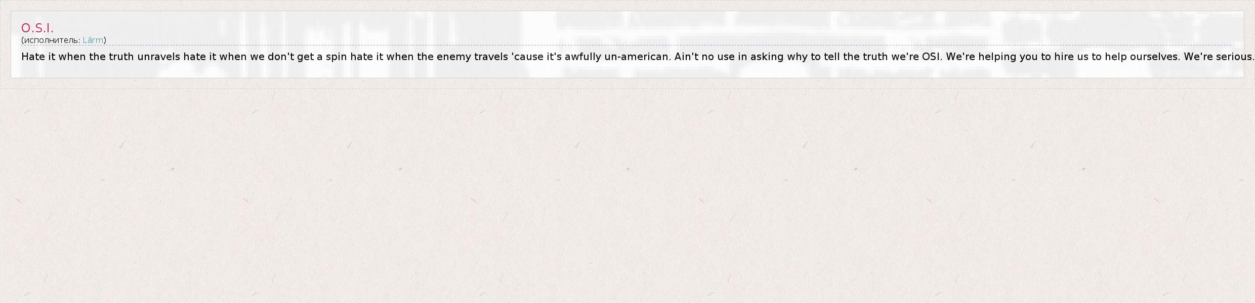 Hate it when the truth unravels hate it when we don't get a spin hate it when the enemy travels 'cause it's awfully un-american. Ain't no use in asking why to tell the truth we're OSI. We're helping you to hire us to help ourselves. We're serious.