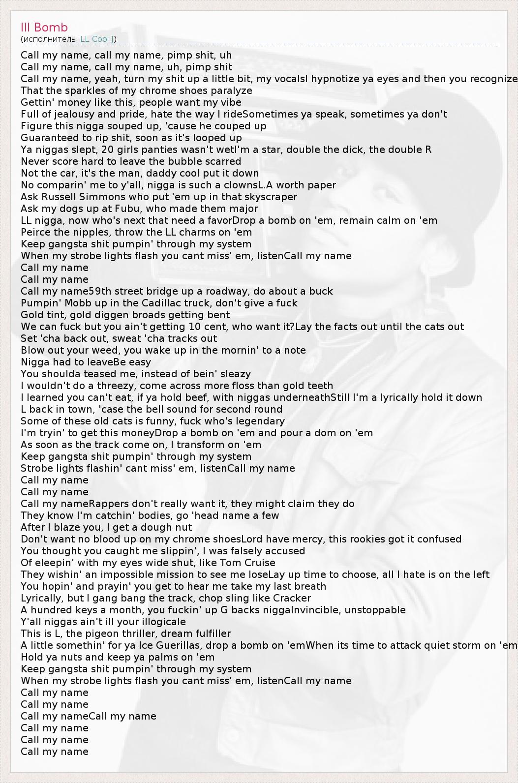 Call my name, call my name, pimp shit, uh Call my name, call my name, uh, pimp shit Call my name, yeah, turn my shit up a little bit, my vocalsI hypnotize ya eyes and then you recognize That the sparkles of my chrome shoes paralyze Gettin' money like this, people want my vibe Full of jealousy and pride, hate the way I rideSometimes ya speak, sometimes ya don't Figure this nigga souped up, 'cause he couped up Guaranteed to rip shit, soon as it's looped up Ya niggas slept, 20 girls panties wasn't wetI'm a star, double the dick, the double R Never score hard to leave the bubble scarred Not the car, it's the man, daddy cool put it down No comparin' me to y'all, nigga is such a clownsL.A worth paper Ask Russell Simmons who put 'em up in that skyscraper Ask my dogs up at Fubu, who made them major LL nigga, now who's next that need a favorDrop a bomb on 'em, remain calm on 'em Peirce the nipples, throw the LL charms on 'em Keep gangsta shit pumpin' through my system When my strobe lights flash you cant miss' em, listenCall my name Call my name Call my name Call my name59th street bridge up a roadway, do about a buck Pumpin' Mobb up in the Cadillac truck, don't give a fuck Gold tint, gold diggen broads getting bent We can fuck but you ain't getting 10 cent, who want it?Lay the facts out until the cats out Set 'cha back out, sweat 'cha tracks out Blow out your weed, you wake up in the mornin' to a note Nigga had to leaveBe easy You shoulda teased me, instead of bein' sleazy I wouldn't do a threezy, come across more floss than gold teeth I learned you can't eat, if ya hold beef, with niggas underneathStill I'm a lyrically hold it down L back in town, 'case the bell sound for second round Some of these old cats is funny, fuck who's legendary I'm tryin' to get this moneyDrop a bomb on 'em and pour a dom on 'em As soon as the track come on, I transform on 'em Keep gangsta shit pumpin' through my system Strobe lights flashin' cant miss' em, listenCall my name Call my name Call my name Call my nameRappers don't really want it, they might claim they do They know I'm catchin' bodies, go 'head name a few After I blaze you, I get a dough nut Don't want no blood up on my chrome shoesLord have mercy, this rookies got it confused You thought you caught me slippin', I was falsely accused Of eleepin' with my eyes wide shut, like Tom Cruise They wishin' an impossible mission to see me loseLay up time to choose, all I hate is on the left You hopin' and prayin' you get to hear me take my last breath Lyrically, but I gang bang the track, chop sling like Cracker A hundred keys a month, you fuckin' up G backs niggaInvincible, unstoppable Y'all niggas ain't ill your illogicale This is L, the pigeon thriller, dream fulfiller A little somethin' for ya Ice Guerillas, drop a bomb on 'emWhen its time to attack quiet storm on 'em Hold ya nuts and keep ya palms on 'em Keep gangsta shit pumpin' through my system When my strobe lights flash you cant miss' em, listenCall my name Call my name Call my name Call my nameCall my name Call my name Call my name Call my name