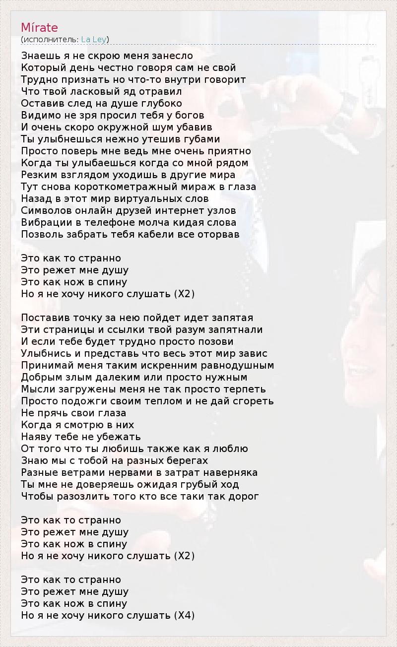 Знаешь я не скрою меня занесло Который день честно говоря сам не свой Трудно признать но что-то внутри говорит Что твой ласковый яд отравил Оставив след на душе глубоко Видимо не зря просил тебя у богов И очень скоро окружной шум убавив Ты улыбнешься нежно утешив губами Просто поверь мне ведь мне очень приятно Когда ты улыбаешься когда со мной рядом Резким взглядом уходишь в другие мира Тут снова короткометражный мираж в глаза Назад в этот мир виртуальных слов Символов онлайн друзей интернет узлов Вибрации в телефоне молча кидая слова Позволь забрать тебя кабели все оторвав Это как то странно Это режет мне душу Это как нож в спину Но я не хочу никого слушать (X2) Поставив точку за нею пойдет идет запятая Эти страницы и ссылки твой разум запятнали И если тебе будет трудно просто позови Улыбнись и представь что весь этот мир завис Принимай меня таким искренним равнодушным Добрым злым далеким или просто нужным Мысли загружены меня не так просто терпеть Просто подожги своим теплом и не дай сгореть Не прячь свои глаза Когда я смотрю в них Наяву тебе не убежать От того что ты любишь также как я люблю Знаю мы с тобой на разных берегах Разные ветрами нервами в затрат наверняка Ты мне не доверяешь ожидая грубый ход Чтобы разозлить того кто все таки так дорог Это как то странно Это режет мне душу Это как нож в спину Но я не хочу никого слушать (X2) Это как то странно Это режет мне душу Это как нож в спину Но я не хочу никого слушать (X4)
