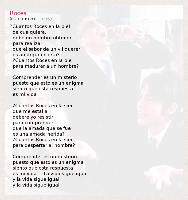 ?Cuantos Roces en la piel de cualquiera, debe un hombre obtener para realizar que el sabor de un vil querer es amargura cierta? ?Cuantos Roces en la piel para madurar a un hombre? Comprender es un misterio puesto que esto es un enigma siento que esta respuesta es mi vida ?Cuantos Roces en la sien que me estalla debere yo resistir para comprender que la amada que se fue es una amada herida? ?Cuantos Roces en la sien para despertar al hombre? Comprender es un misterio puesto que esto es un enigma siento que esta respuesta es mi vida... La vida sigue igual y la vida sigue igual y la vida sigue igual