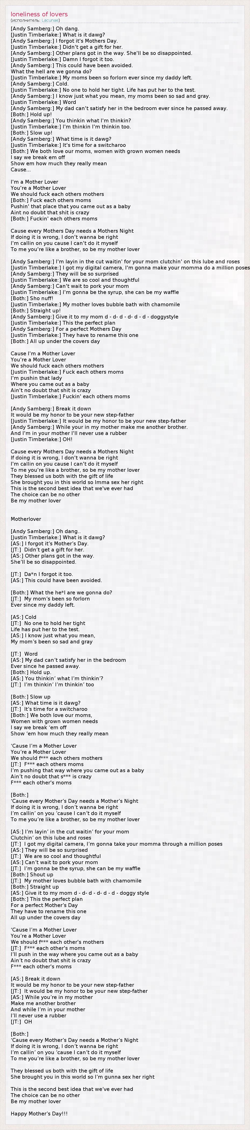 [Andy Samberg:] Oh dang. [Justin Timberlake:] What is it dawg? [Andy Samberg:] I forgot it's Mothers Day. [Justin Timberlake:] Didn't get a gift for her. [Andy Samberg:] Other plans got in the way. She'll be so disappointed. [Justin Timberlake:] Damn I forgot it too. [Andy Samberg:] This could have been avoided. What the hell are we gonna do? [Justin Timberlake:] My moms been so forlorn ever since my daddy left. [Andy Samberg:] Cold. [Justin Timberlake:] No one to hold her tight. Life has put her to the test. [Andy Samberg:] I know just what you mean, my moms been so sad and gray. [Justin Timberlake:] Word [Andy Samberg:] My dad can't satisfy her in the bedroom ever since he passed away. [Both:] Hold up! [Andy Samberg:] You thinkin what I'm thinkin? [Justin Timberlake:] I'm thinkin I'm thinkin too. [Both:] Slow up! [Andy Samberg:] What time is it dawg? [Justin Timberlake:] It's time for a switcharoo [Both:] We both love our moms, women with grown women needs I say we break em off Show em how much they really mean Cause... I'm a Mother Lover You're a Mother Lover We should fuck each others mothers [Both:] Fuck each others moms Pushin' that place that you came out as a baby Aint no doubt that shit is crazy [Both:] Fuckin' each others moms Cause every Mothers Day needs a Mothers Night If doing it is wrong, I don't wanna be right I'm callin on you cause I can't do it myself To me you're like a brother, so be my mother lover [Andy Samberg:] I'm layin in the cut waitin' for your mom clutchin' on this lube and roses [Justin Timberlake:] I got my digital camera, I'm gonna make your momma do a million poses [Andy Samberg:] They will be so surprised [Justin Timberlake:] We are so cool and thoughtful [Andy Samberg:] Can't wait to pork your mom [Justin Timberlake:] I'm gonna be the syrup, she can be my waffle [Both:] Sho nuff! [Justin Timberlake:] My mother loves bubble bath with chamomile [Both:] Straight up! [Andy Samberg:] Give it to my mom d - d- d - d- d - d - doggystyle [Justin Timberlake:] This the perfect plan [Andy Samberg:] For a perfect Mothers Day [Justin Timberlake:] They have to rename this one [Both:] All up under the covers day Cause I'm a Mother Lover You're a Mother Lover We should fuck each others mothers [Justin Timberlake:] Fuck each others moms I'm pushin that lady Where you came out as a baby Ain't no doubt that shit is crazy [Justin Timberlake:] Fuckin' each others moms [Andy Samberg:] Break it down It would be my honor to be your new step-father [Justin Timberlake:] It would be my honor to be your new step-father [Andy Samberg:] While your in my mother make me another brother. And I'm in your mother I'll never use a rubber [Justin Timberlake:] OH! Cause every Mothers Day needs a Mothers Night If doing it is wrong, I don't wanna be right I'm callin on you cause I can't do it myself To me you're like a brother, so be my mother lover They blessed us both with the gift of life She brought you in this world so Imma sex her right This is the second best idea that we've ever had The choice can be no other Be my mother lover Motherlover [Andy Samberg:] Oh dang.. [Justin Timberlake:] What is it dawg? [AS:] I forgot it’s Mother’s Day. [JT:] Didn’t get a gift for her. [AS:] Other plans got in the way. She’ll be so disappointed. [JT:] Da*n I forgot it too. [AS:] This could have been avoided. [Both:] What the he*l are we gonna do? [JT:] My mom’s been so forlorn Ever since my daddy left. [AS:] Cold [JT:] No one to hold her tight Life has put her to the test. [AS:] I know just what you mean, My mom’s been so sad and gray [JT:] Word [AS:] My dad can’t satisfy her in the bedroom Ever since he passed away. [Both:] Hold up. [AS:] You thinkin’ what I’m thinkin’? [JT:] I’m thinkin’ I’m thinkin’ too [Both:] Slow up [AS:] What time is it dawg? [JT:] It’s time for a switcharoo [Both:] We both love our moms, Women with grown women needs I say we break ‘em off Show ‘em how much they really mean ‘Cause I’m a Mother Lover You’re a Mother Lover We should f*** each others mothers [JT:] F*** each others moms I’m pushing that way where you came out as a baby Ain’t no doubt that s*** is crazy F*** each other's moms [Both:] ‘Cause every Mother’s Day needs a Mother’s Night If doing it is wrong, I don’t wanna be right I’m callin’ on you ’cause I can’t do it myself To me you’re like a brother, so be my mother lover [AS:] I’m layin’ in the cut waitin’ for your mom Clutchin’ on this lube and roses [JT:] I got my digital camera, I’m gonna take your momma through a million poses [AS:] They will be so surprised [JT:] We are so cool and thoughtful [AS:] Can’t wait to pork your mom [JT:] I’m gonna be the syrup, she can be my waffle [Both:] Shout up [JT:] My mother loves bubble bath with chamomile [Both:] Straight up [AS:] Give it to my mom d - d- d - d- d - d - doggy style [Both:] This the perfect plan For a perfect Mother’s Day They have to rename this one All up under the covers day ‘Cause I’m a Mother Lover You’re a Mother Lover We should f*** each other's mothers [JT:] F*** each other's moms I’ll push in the way where you came out as a baby Ain’t no doubt that shit is crazy F*** each other's moms [AS:] Break it down It would be my honor to be your new step-father [JT:] It would be my honor to be your new step-father [AS:] While you’re in my mother Make me another brother And while I’m in your mother I’ll never use a rubber [JT:] OH [Both:] ‘Cause every Mother’s Day needs a Mother’s Night If doing it is wrong, I don’t wanna be right I’m callin’ on you ’cause I can’t do it myself To me you’re like a brother, so be my mother lover They blessed us both with the gift of life She brought you in this world so I’m gunna sex her right This is the second best idea that we’ve ever had The choice can be no other Be my mother lover Happy Mother’s Day!!!