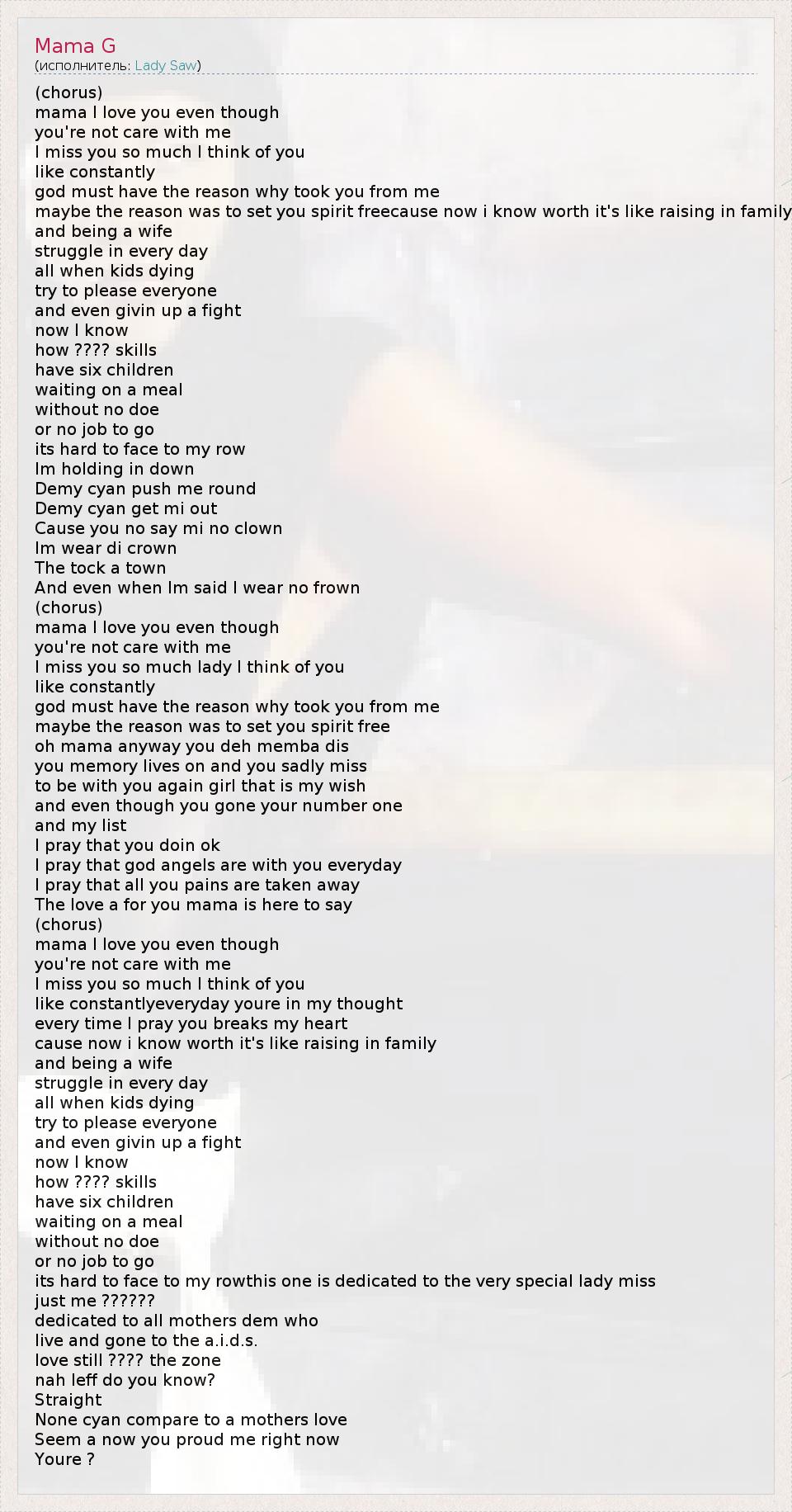 (chorus) mama I love you even though you're not care with me I miss you so much I think of you like constantly god must have the reason why took you from me maybe the reason was to set you spirit freecause now i know worth it's like raising in family and being a wife struggle in every day all when kids dying try to please everyone and even givin up a fight now I know how ???? skills have six children waiting on a meal without no doe or no job to go its hard to face to my row Im holding in down Demy cyan push me round Demy cyan get mi out Cause you no say mi no clown Im wear di crown The tock a town And even when Im said I wear no frown (chorus) mama I love you even though you're not care with me I miss you so much lady I think of you like constantly god must have the reason why took you from me maybe the reason was to set you spirit free oh mama anyway you deh memba dis you memory lives on and you sadly miss to be with you again girl that is my wish and even though you gone your number one and my list I pray that you doin ok I pray that god angels are with you everyday I pray that all you pains are taken away The love a for you mama is here to say (chorus) mama I love you even though you're not care with me I miss you so much I think of you like constantlyeveryday youre in my thought every time I pray you breaks my heart cause now i know worth it's like raising in family and being a wife struggle in every day all when kids dying try to please everyone and even givin up a fight now I know how ???? skills have six children waiting on a meal without no doe or no job to go its hard to face to my rowthis one is dedicated to the very special lady miss just me ?????? dedicated to all mothers dem who live and gone to the a.i.d.s. love still ???? the zone nah leff do you know? Straight None cyan compare to a mothers love Seem a now you proud me right now Youre ?