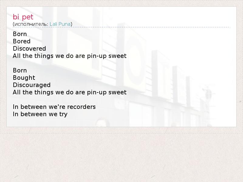 Это интересно:Cегодня Lali Puna, пожалуй, — модная немецкая группа. Особенно знамениты они стали после выхода в уходящем году своего третьего альбома, «Faking the books». Диск с логотипом Morr Music в черно-желтой обложке можно встретить на главных полках музыкальных магазинов, их мировой тур имеет фантастический успех, а вокалистка группы, загадочная восточная девушка Валери Требельяр, стала образом музыки будущего.... продолжение