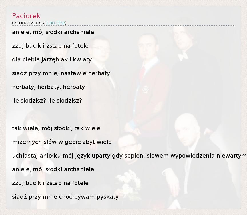 Это интересно:Польская группа Lao Che образовалась в 1999 году. Её основу составили музыканты коллектива Koli. Жанр, в котором играют музыканты чётко определить нельзя. Их музыка - смесь альтернативы, панк-рока, ска, фолка и амбиента.Свою популярность ребята обрели благодаря альбому Powstanie Warszawskie (Варшавское восстание).Сейчас в Lao Che играют: * Mariusz "Denat" Denst (сэмплы) * Hubert "Spięty" Dobaczewski (вокал,... продолжение