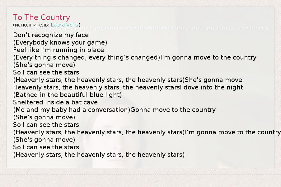 Don't recognize my face (Everybody knows your game) Feel like I'm running in place (Every thing's changed, every thing's changed)I'm gonna move to the country (She's gonna move) So I can see the stars (Heavenly stars, the heavenly stars, the heavenly stars)She's gonna move Heavenly stars, the heavenly stars, the heavenly starsI dove into the night (Bathed in the beautiful blue light) Sheltered inside a bat cave (Me and my baby had a conversation)Gonna move to the country (She's gonna move) So I can see the stars (Heavenly stars, the heavenly stars, the heavenly stars)I'm gonna move to the country (She's gonna move) So I can see the stars (Heavenly stars, the heavenly stars, the heavenly stars)