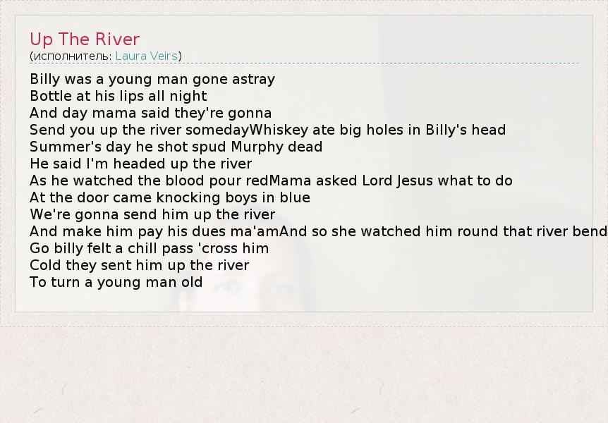 And make him pay his dues ma'amAnd so she watched him round that river bend