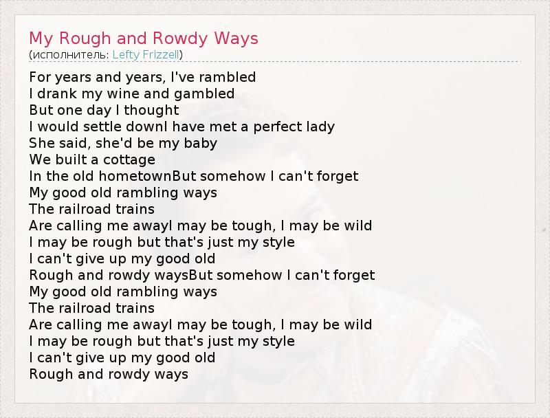 For years and years, I've rambled I drank my wine and gambled But one day I thought I would settle downI have met a perfect lady She said, she'd be my baby We built a cottage In the old hometownBut somehow I can't forget My good old rambling ways The railroad trains Are calling me awayI may be tough, I may be wild I may be rough but that's just my style I can't give up my good old Rough and rowdy waysBut somehow I can't forget My good old rambling ways The railroad trains Are calling me awayI may be tough, I may be wild I may be rough but that's just my style I can't give up my good old Rough and rowdy ways