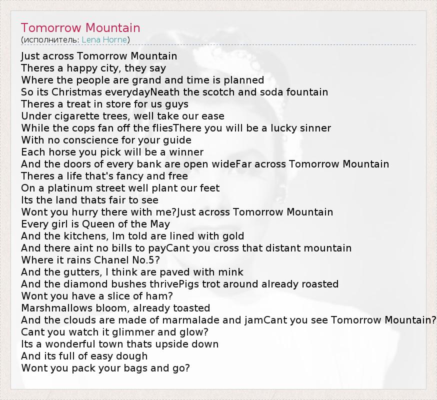 Wont you hurry there with me?Just across Tomorrow Mountain