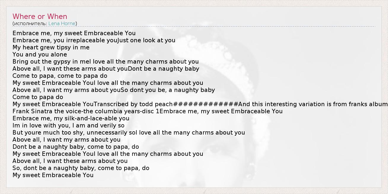 Embrace me, my sweet Embraceable You Embrace me, you irreplaceable youJust one look at you My heart grew tipsy in me You and you alone Bring out the gypsy in meI love all the many charms about you Above all, I want these arms about youDont be a naughty baby Come to papa, come to papa do My sweet Embraceable YouI love all the many charms about you Above all, I want my arms about youSo dont you be, a naughty baby Come to papa do My sweet Embraceable YouTranscribed by todd peach#############And this interesting variation is from franks album Frank Sinatra the voice-the columbia years-disc 1Embrace me, my sweet Embraceable You Embrace me, my silk-and-lace-able you Im in love with you, I am and verily so But youre much too shy, unnecessarily soI love all the many charms about you Above all, I want my arms about you Dont be a naughty baby, come to papa, do My sweet Embraceable YouI love all the many charms about you Above all, I want these arms about you So, dont be a naughty baby, come to papa, do My sweet Embraceable You