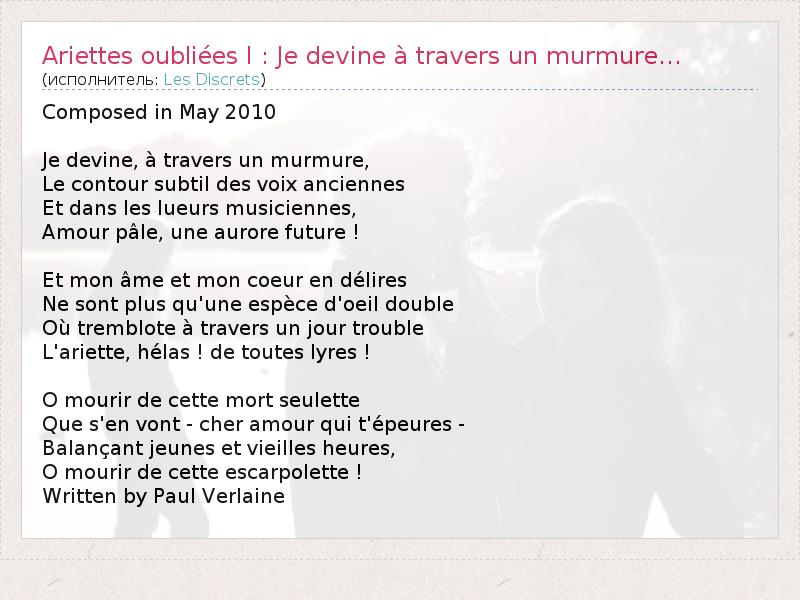 А как ты думаешь, о чем песня "Ariettes oubliées I : Je devine à travers un murmure..." ?