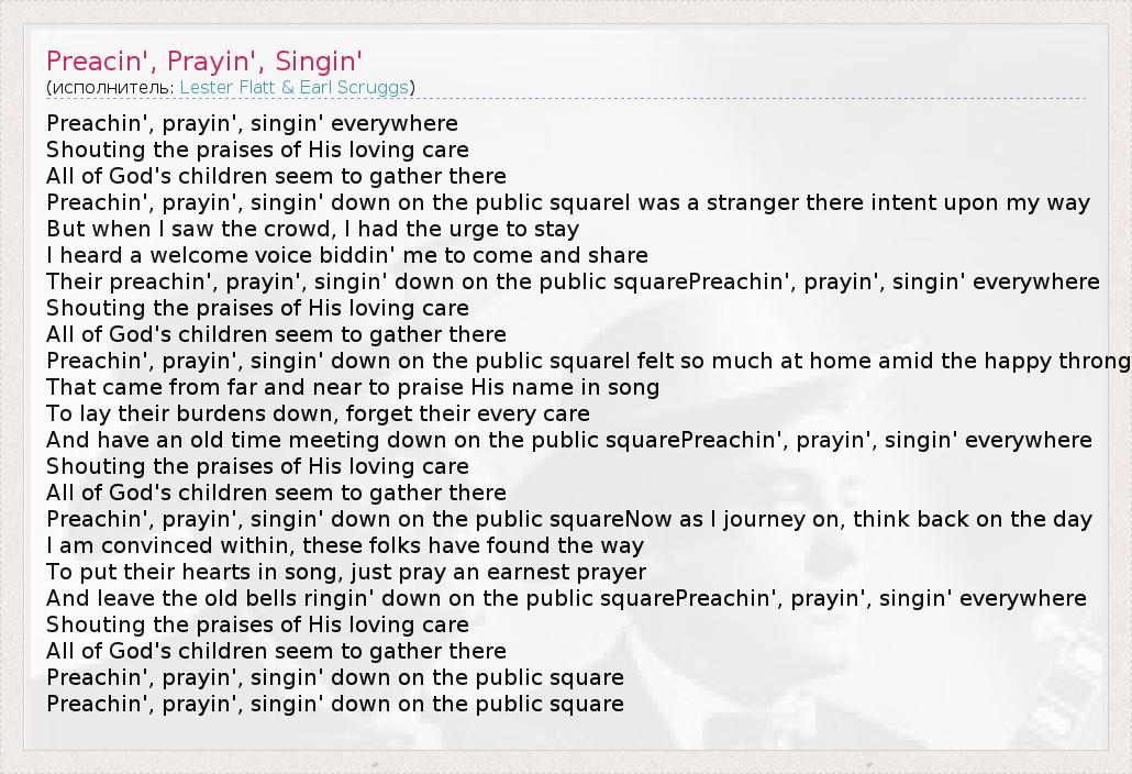 А как ты думаешь, о чем песня "Preacin', Prayin', Singin'" ?