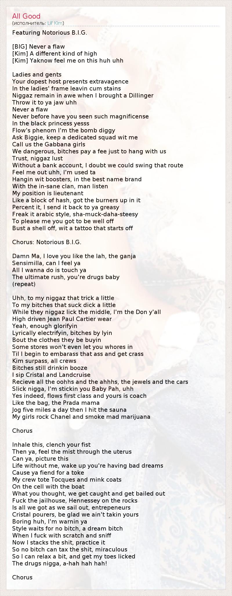 Featuring Notorious B.I.G. [BIG] Never a flaw [Kim] A different kind of high [Kim] Yaknow feel me on this huh uhh Ladies and gents Your dopest host presents extravagence In the ladies' frame leavin cum stains Niggaz remain in awe when I brought a Dillinger Throw it to ya jaw uhh Never a flaw Never before have you seen such magnificense In the black princess yesss Flow's phenom I'm the bomb diggy Ask Biggie, keep a dedicated squad wit me Call us the Gabbana girls We dangerous, bitches pay a fee just to hang with us Trust, niggaz lust Without a bank account, I doubt we could swing that route Feel me out uhh, I'm used ta Hangin wit boosters, in the best name brand With the in-sane clan, man listen My position is lieutenant Like a block of hash, got the burners up in it Percent it, I send it back to ya greasy Freak it arabic style, sha-muck-daha-steesy To please me you got to be well off Bust a shell off, wit a tattoo that starts off Chorus: Notorious B.I.G. Damn Ma, I love you like the lah, the ganja Sensimilla, can I feel ya All I wanna do is touch ya The ultimate rush, you're drugs baby (repeat) Uhh, to my niggaz that trick a little To my bitches that suck dick a little While they niggaz lick the middle, I'm the Don y'all High driven Jean Paul Cartier wear Yeah, enough glorifyin Lyrically electrifyin, bitches by lyin Bout the clothes they be buyin Some stores won't even let you whores in Til I begin to embarass that ass and get crass Kim surpass, all crews Bitches still drinkin booze I sip Cristal and Landcruise Recieve all the oohhs and the ahhhs, the jewels and the cars Slick nigga, I'm stickin you Baby Pah, uhh Yes indeed, flows first class and yours is coach Like the bag, the Prada mama Jog five miles a day then I hit the sauna My girls rock Chanel and smoke mad marijuana Chorus Inhale this, clench your fist Then ya, feel the mist through the uterus Can ya, picture this Life without me, wake up you're having bad dreams Cause ya fiend for a toke My crew tote Tocques and mink coats On the cell with the boat What you thought, we get caught and get bailed out Fuck the jailhouse, Hennessey on the rocks Is all we got as we sail out, entrepeneurs Cristal pourers, be glad we ain't takin yours Boring huh, I'm warnin ya Style waits for no bitch, a dream bitch When I fuck with scratch and sniff Now I stacks the shit, practice it So no bitch can tax the shit, miraculous So I can relax a bit, and get my toes licked The drugs nigga, a-hah hah hah! Chorus