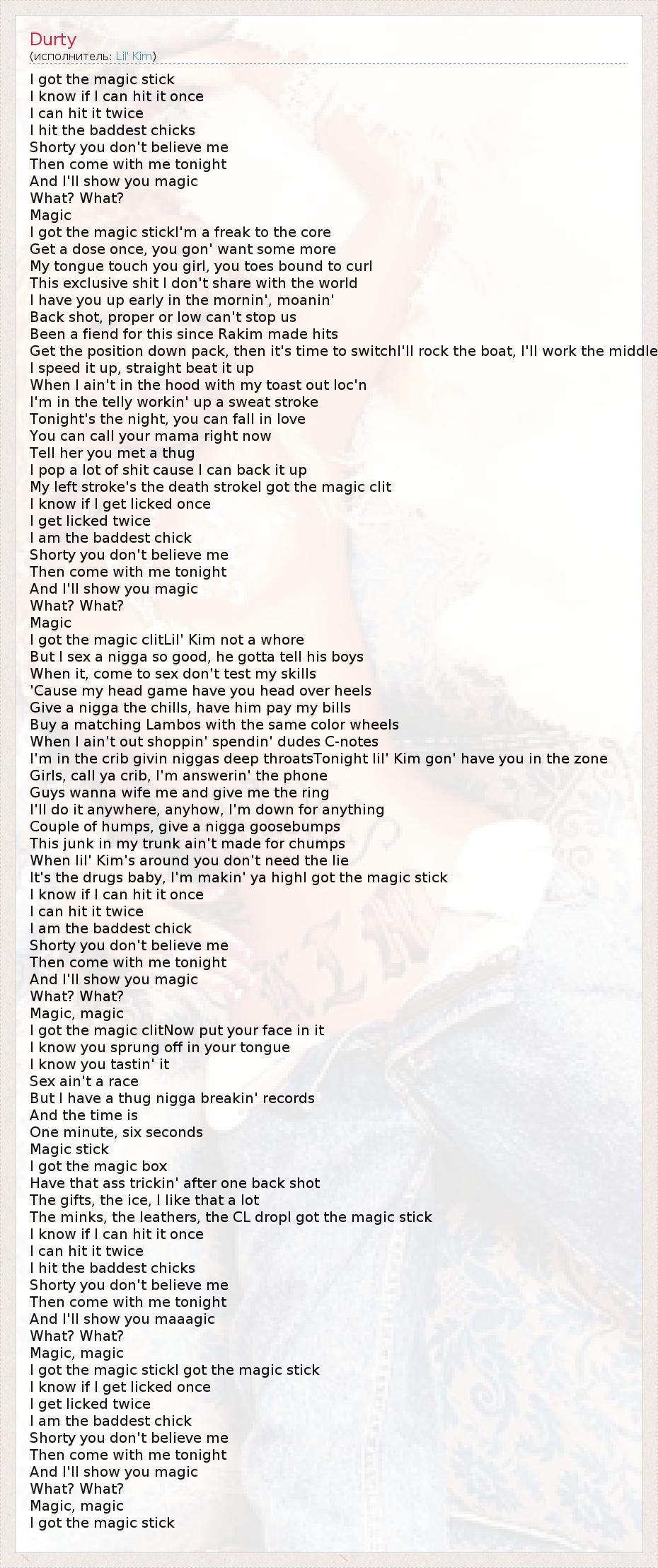 Это интересно:Имя: Kimberly Denise Jones.Псевдоним: Lil' Kim.Дата и место рождения: 11 июля 1975 года, Бруклин, Нью-Йорк.После развода родителей, когда Ким было 9 лет, она стала жить с отцом. Изначально Ким и ее старший брат Кристофер, жили с матерью, до тех пор, пока опека над детьми не была передана её отцу. Ким была непослушным ребёнком, но ей приходилось жить по строгим правила её отца, из-за чего, они постоянно... продолжение