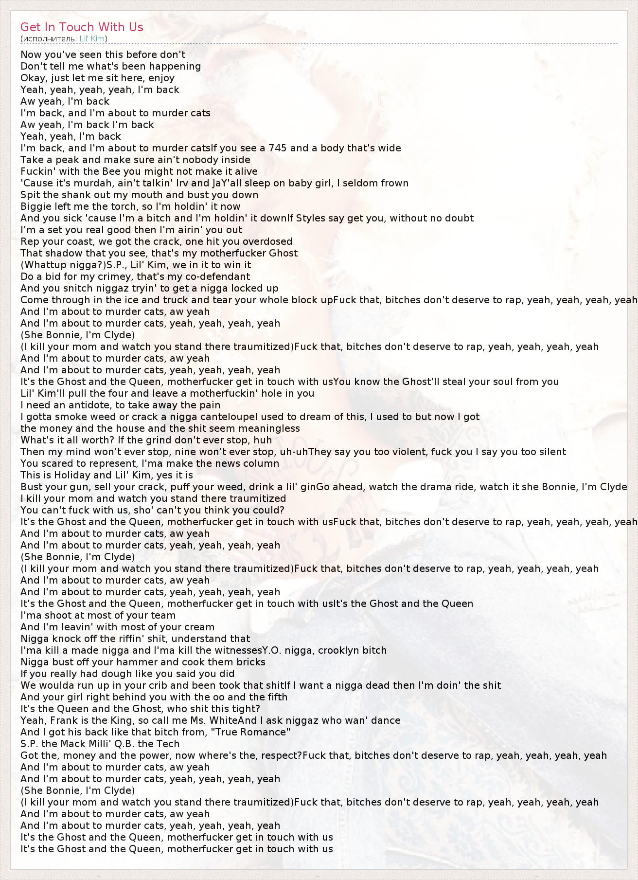 Now you've seen this before don't Don't tell me what's been happening Okay, just let me sit here, enjoy Yeah, yeah, yeah, yeah, I'm back Aw yeah, I'm back I'm back, and I'm about to murder cats Aw yeah, I'm back I'm back Yeah, yeah, I'm back I'm back, and I'm about to murder catsIf you see a 745 and a body that's wide Take a peak and make sure ain't nobody inside Fuckin' with the Bee you might not make it alive 'Cause it's murdah, ain't talkin' Irv and JaY'all sleep on baby girl, I seldom frown Spit the shank out my mouth and bust you down Biggie left me the torch, so I'm holdin' it now And you sick 'cause I'm a bitch and I'm holdin' it downIf Styles say get you, without no doubt I'm a set you real good then I'm airin' you out Rep your coast, we got the crack, one hit you overdosed That shadow that you see, that's my motherfucker Ghost (Whattup nigga?)S.P., Lil' Kim, we in it to win it Do a bid for my crimey, that's my co-defendant And you snitch niggaz tryin' to get a nigga locked up Come through in the ice and truck and tear your whole block upFuck that, bitches don't deserve to rap, yeah, yeah, yeah, yeah And I'm about to murder cats, aw yeah And I'm about to murder cats, yeah, yeah, yeah, yeah (She Bonnie, I'm Clyde) (I kill your mom and watch you stand there traumitized)Fuck that, bitches don't deserve to rap, yeah, yeah, yeah, yeah And I'm about to murder cats, aw yeah And I'm about to murder cats, yeah, yeah, yeah, yeah It's the Ghost and the Queen, motherfucker get in touch with usYou know the Ghost'll steal your soul from you Lil' Kim'll pull the four and leave a motherfuckin' hole in you I need an antidote, to take away the pain I gotta smoke weed or crack a nigga canteloupeI used to dream of this, I used to but now I got the money and the house and the shit seem meaningless What's it all worth? If the grind don't ever stop, huh Then my mind won't ever stop, nine won't ever stop, uh-uhThey say you too violent, fuck you I say you too silent You scared to represent, I'ma make the news column This is Holiday and Lil' Kim, yes it is Bust your gun, sell your crack, puff your weed, drink a lil' ginGo ahead, watch the drama ride, watch it she Bonnie, I'm Clyde I kill your mom and watch you stand there traumitized You can't fuck with us, sho' can't you think you could? It's the Ghost and the Queen, motherfucker get in touch with usFuck that, bitches don't deserve to rap, yeah, yeah, yeah, yeah And I'm about to murder cats, aw yeah And I'm about to murder cats, yeah, yeah, yeah, yeah (She Bonnie, I'm Clyde) (I kill your mom and watch you stand there traumitized)Fuck that, bitches don't deserve to rap, yeah, yeah, yeah, yeah And I'm about to murder cats, aw yeah And I'm about to murder cats, yeah, yeah, yeah, yeah It's the Ghost and the Queen, motherfucker get in touch with usIt's the Ghost and the Queen I'ma shoot at most of your team And I'm leavin' with most of your cream Nigga knock off the riffin' shit, understand that I'ma kill a made nigga and I'ma kill the witnessesY.O. nigga, crooklyn bitch Nigga bust off your hammer and cook them bricks If you really had dough like you said you did We woulda run up in your crib and been took that shitIf I want a nigga dead then I'm doin' the shit And your girl right behind you with the oo and the fifth It's the Queen and the Ghost, who shit this tight? Yeah, Frank is the King, so call me Ms. WhiteAnd I ask niggaz who wan' dance And I got his back like that bitch from, "True Romance" S.P. the Mack Milli' Q.B. the Tech Got the, money and the power, now where's the, respect?Fuck that, bitches don't deserve to rap, yeah, yeah, yeah, yeah And I'm about to murder cats, aw yeah And I'm about to murder cats, yeah, yeah, yeah, yeah (She Bonnie, I'm Clyde) (I kill your mom and watch you stand there traumitized)Fuck that, bitches don't deserve to rap, yeah, yeah, yeah, yeah And I'm about to murder cats, aw yeah And I'm about to murder cats, yeah, yeah, yeah, yeah It's the Ghost and the Queen, motherfucker get in touch with us It's the Ghost and the Queen, motherfucker get in touch with us