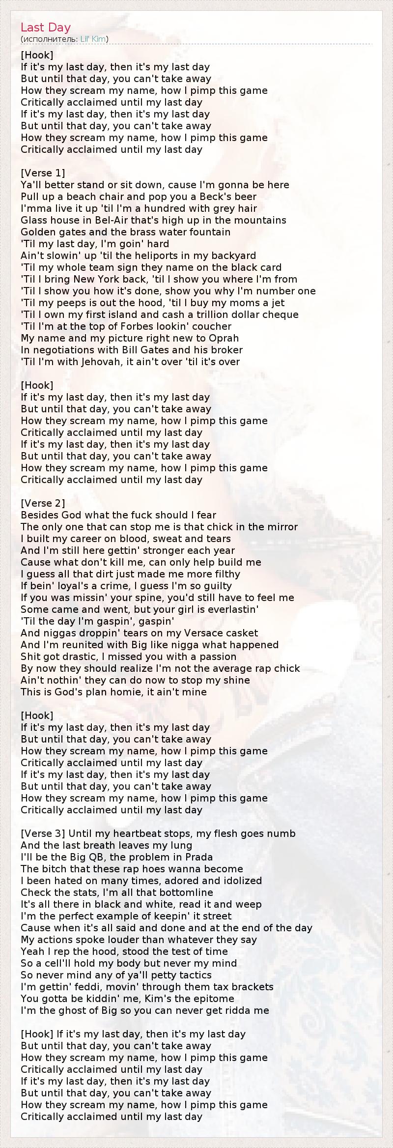 [Hook] If it's my last day, then it's my last day But until that day, you can't take away How they scream my name, how I pimp this game Critically acclaimed until my last day If it's my last day, then it's my last day But until that day, you can't take away How they scream my name, how I pimp this game Critically acclaimed until my last day [Verse 1] Ya'll better stand or sit down, cause I'm gonna be here Pull up a beach chair and pop you a Beck's beer I'mma live it up 'til I'm a hundred with grey hair Glass house in Bel-Air that's high up in the mountains Golden gates and the brass water fountain 'Til my last day, I'm goin' hard Ain't slowin' up 'til the heliports in my backyard 'Til my whole team sign they name on the black card 'Til I bring New York back, 'til I show you where I'm from 'Til I show you how it's done, show you why I'm number one 'Til my peeps is out the hood, 'til I buy my moms a jet 'Til I own my first island and cash a trillion dollar cheque 'Til I'm at the top of Forbes lookin' coucher My name and my picture right new to Oprah In negotiations with Bill Gates and his broker 'Til I'm with Jehovah, it ain't over 'til it's over [Hook] If it's my last day, then it's my last day But until that day, you can't take away How they scream my name, how I pimp this game Critically acclaimed until my last day If it's my last day, then it's my last day But until that day, you can't take away How they scream my name, how I pimp this game Critically acclaimed until my last day [Verse 2] Besides God what the fuck should I fear The only one that can stop me is that chick in the mirror I built my career on blood, sweat and tears And I'm still here gettin' stronger each year Cause what don't kill me, can only help build me I guess all that dirt just made me more filthy If bein' loyal's a crime, I guess I'm so guilty If you was missin' your spine, you'd still have to feel me Some came and went, but your girl is everlastin' 'Til the day I'm gaspin', gaspin' And niggas droppin' tears on my Versace casket And I'm reunited with Big like nigga what happened Shit got drastic, I missed you with a passion By now they should realize I'm not the average rap chick Ain't nothin' they can do now to stop my shine This is God's plan homie, it ain't mine [Hook] If it's my last day, then it's my last day But until that day, you can't take away How they scream my name, how I pimp this game Critically acclaimed until my last day If it's my last day, then it's my last day But until that day, you can't take away How they scream my name, how I pimp this game Critically acclaimed until my last day [Verse 3] Until my heartbeat stops, my flesh goes numb And the last breath leaves my lung I'll be the Big QB, the problem in Prada The bitch that these rap hoes wanna become I been hated on many times, adored and idolized Check the stats, I'm all that bottomline It's all there in black and white, read it and weep I'm the perfect example of keepin' it street Cause when it's all said and done and at the end of the day My actions spoke louder than whatever they say Yeah I rep the hood, stood the test of time So a cell'll hold my body but never my mind So never mind any of ya'll petty tactics I'm gettin' feddi, movin' through them tax brackets You gotta be kiddin' me, Kim's the epitome I'm the ghost of Big so you can never get ridda me [Hook] If it's my last day, then it's my last day But until that day, you can't take away How they scream my name, how I pimp this game Critically acclaimed until my last day If it's my last day, then it's my last day But until that day, you can't take away How they scream my name, how I pimp this game Critically acclaimed until my last day