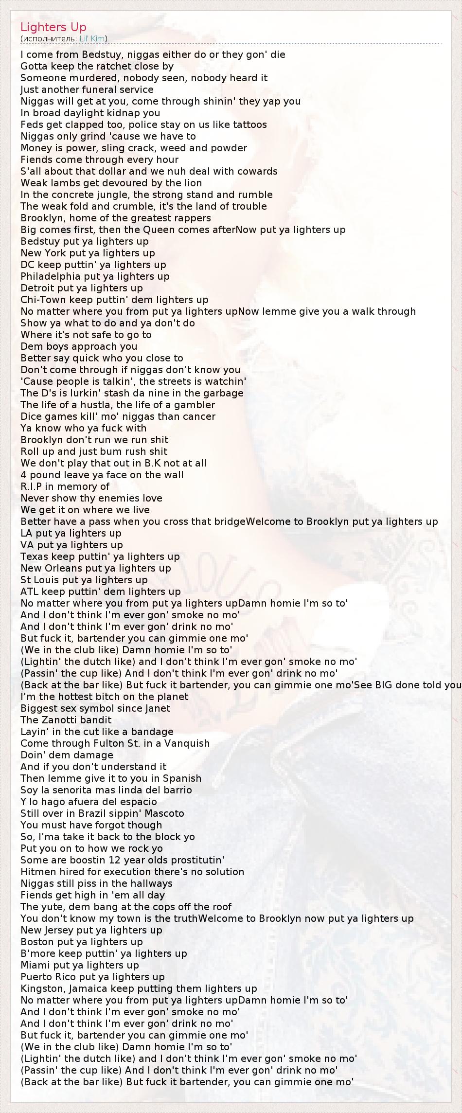 Это интересно:Имя: Kimberly Denise Jones.Псевдоним: Lil' Kim.Дата и место рождения: 11 июля 1975 года, Бруклин, Нью-Йорк.После развода родителей, когда Ким было 9 лет, она стала жить с отцом. Изначально Ким и ее старший брат Кристофер, жили с матерью, до тех пор, пока опека над детьми не была передана её отцу. Ким была непослушным ребёнком, но ей приходилось жить по строгим правила её отца, из-за чего, они постоянно... продолжение