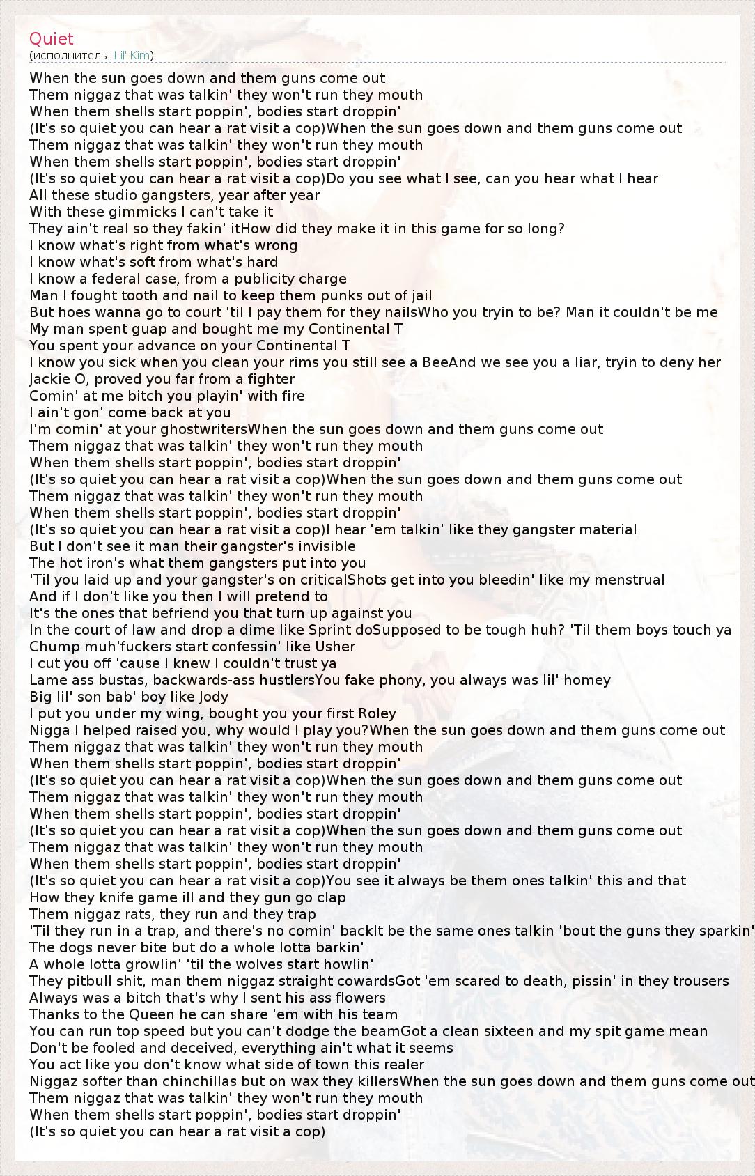 When the sun goes down and them guns come out Them niggaz that was talkin' they won't run they mouth When them shells start poppin', bodies start droppin' (It's so quiet you can hear a rat visit a cop)When the sun goes down and them guns come out Them niggaz that was talkin' they won't run they mouth When them shells start poppin', bodies start droppin' (It's so quiet you can hear a rat visit a cop)Do you see what I see, can you hear what I hear All these studio gangsters, year after year With these gimmicks I can't take it They ain't real so they fakin' itHow did they make it in this game for so long? I know what's right from what's wrong I know what's soft from what's hard I know a federal case, from a publicity charge Man I fought tooth and nail to keep them punks out of jail But hoes wanna go to court 'til I pay them for they nailsWho you tryin to be? Man it couldn't be me My man spent guap and bought me my Continental T You spent your advance on your Continental T I know you sick when you clean your rims you still see a BeeAnd we see you a liar, tryin to deny her Jackie O, proved you far from a fighter Comin' at me bitch you playin' with fire I ain't gon' come back at you I'm comin' at your ghostwritersWhen the sun goes down and them guns come out Them niggaz that was talkin' they won't run they mouth When them shells start poppin', bodies start droppin' (It's so quiet you can hear a rat visit a cop)When the sun goes down and them guns come out Them niggaz that was talkin' they won't run they mouth When them shells start poppin', bodies start droppin' (It's so quiet you can hear a rat visit a cop)I hear 'em talkin' like they gangster material But I don't see it man their gangster's invisible The hot iron's what them gangsters put into you 'Til you laid up and your gangster's on criticalShots get into you bleedin' like my menstrual And if I don't like you then I will pretend to It's the ones that befriend you that turn up against you In the court of law and drop a dime like Sprint doSupposed to be tough huh? 'Til them boys touch ya Chump muh'fuckers start confessin' like Usher I cut you off 'cause I knew I couldn't trust ya Lame ass bustas, backwards-ass hustlersYou fake phony, you always was lil' homey Big lil' son bab' boy like Jody I put you under my wing, bought you your first Roley Nigga I helped raised you, why would I play you?When the sun goes down and them guns come out Them niggaz that was talkin' they won't run they mouth When them shells start poppin', bodies start droppin' (It's so quiet you can hear a rat visit a cop)When the sun goes down and them guns come out Them niggaz that was talkin' they won't run they mouth When them shells start poppin', bodies start droppin' (It's so quiet you can hear a rat visit a cop)When the sun goes down and them guns come out Them niggaz that was talkin' they won't run they mouth When them shells start poppin', bodies start droppin' (It's so quiet you can hear a rat visit a cop)You see it always be them ones talkin' this and that How they knife game ill and they gun go clap Them niggaz rats, they run and they trap 'Til they run in a trap, and there's no comin' backIt be the same ones talkin 'bout the guns they sparkin' The dogs never bite but do a whole lotta barkin' A whole lotta growlin' 'til the wolves start howlin' They pitbull shit, man them niggaz straight cowardsGot 'em scared to death, pissin' in they trousers Always was a bitch that's why I sent his ass flowers Thanks to the Queen he can share 'em with his team You can run top speed but you can't dodge the beamGot a clean sixteen and my spit game mean Don't be fooled and deceived, everything ain't what it seems You act like you don't know what side of town this realer Niggaz softer than chinchillas but on wax they killersWhen the sun goes down and them guns come out Them niggaz that was talkin' they won't run they mouth When them shells start poppin', bodies start droppin' (It's so quiet you can hear a rat visit a cop)