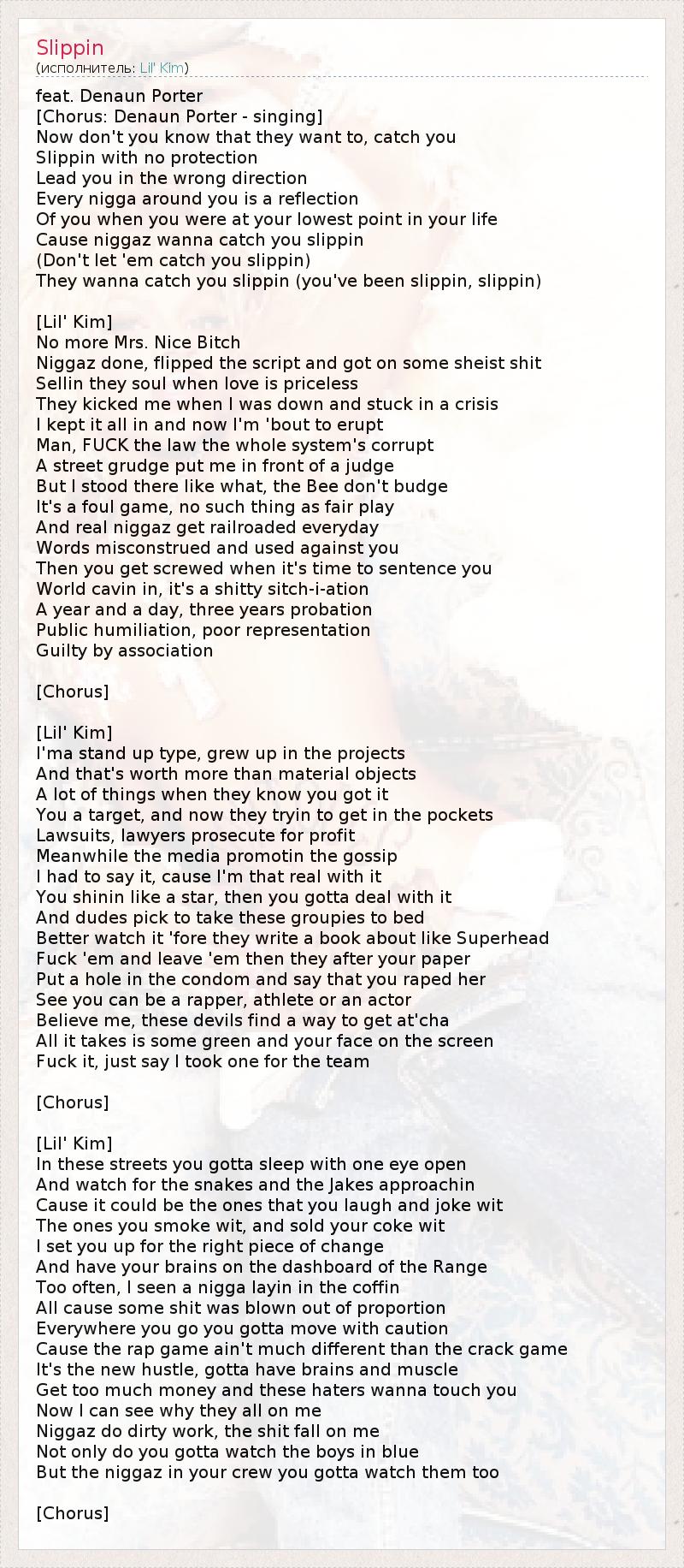 feat. Denaun Porter [Chorus: Denaun Porter - singing] Now don't you know that they want to, catch you Slippin with no protection Lead you in the wrong direction Every nigga around you is a reflection Of you when you were at your lowest point in your life Cause niggaz wanna catch you slippin (Don't let 'em catch you slippin) They wanna catch you slippin (you've been slippin, slippin) [Lil' Kim] No more Mrs. Nice Bitch Niggaz done, flipped the script and got on some sheist shit Sellin they soul when love is priceless They kicked me when I was down and stuck in a crisis I kept it all in and now I'm 'bout to erupt Man, FUCK the law the whole system's corrupt A street grudge put me in front of a judge But I stood there like what, the Bee don't budge It's a foul game, no such thing as fair play And real niggaz get railroaded everyday Words misconstrued and used against you Then you get screwed when it's time to sentence you World cavin in, it's a shitty sitch-i-ation A year and a day, three years probation Public humiliation, poor representation Guilty by association [Chorus] [Lil' Kim] I'ma stand up type, grew up in the projects And that's worth more than material objects A lot of things when they know you got it You a target, and now they tryin to get in the pockets Lawsuits, lawyers prosecute for profit Meanwhile the media promotin the gossip I had to say it, cause I'm that real with it You shinin like a star, then you gotta deal with it And dudes pick to take these groupies to bed Better watch it 'fore they write a book about like Superhead Fuck 'em and leave 'em then they after your paper Put a hole in the condom and say that you raped her See you can be a rapper, athlete or an actor Believe me, these devils find a way to get at'cha All it takes is some green and your face on the screen Fuck it, just say I took one for the team [Chorus] [Lil' Kim] In these streets you gotta sleep with one eye open And watch for the snakes and the Jakes approachin Cause it could be the ones that you laugh and joke wit The ones you smoke wit, and sold your coke wit I set you up for the right piece of change And have your brains on the dashboard of the Range Too often, I seen a nigga layin in the coffin All cause some shit was blown out of proportion Everywhere you go you gotta move with caution Cause the rap game ain't much different than the crack game It's the new hustle, gotta have brains and muscle Get too much money and these haters wanna touch you Now I can see why they all on me Niggaz do dirty work, the shit fall on me Not only do you gotta watch the boys in blue But the niggaz in your crew you gotta watch them too [Chorus]