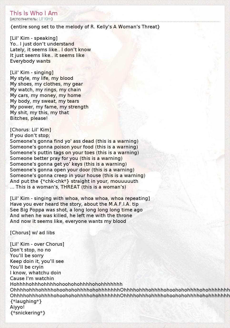 {entire song set to the melody of R. Kelly's A Woman's Threat}
