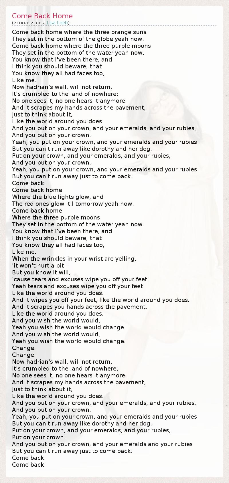 Come back home where the three orange suns They set in the bottom of the globe yeah now. Come back home where the three purple moons They set in the bottom of the water yeah now. You know that I've been there, and I think you should beware; that You know they all had faces too, Like me. Now hadrian's wall, will not return, It's crumbled to the land of nowhere; No one sees it, no one hears it anymore. And it scrapes my hands across the pavement, Just to think about it, Like the world around you does. And you put on your crown, and your emeralds, and your rubies, And you but on your crown. Yeah, you put on your crown, and your emeralds and your rubies But you can't run away like dorothy and her dog. Put on your crown, and your emeralds, and your rubies, And you put on your crown. Yeah, you put on your crown, and your emeralds and your rubies But you can't run away just to come back. Come back. Come back home Where the blue lights glow, and The red ones glow 'til tomorrow yeah now. Come back home Where the three purple moons They set in the bottom of the water yeah now. You know that I've been there, and I think you should beware; that You know they all had faces too, Like me. When the wrinkles in your wrist are yelling, 'it won't hurt a bit!' But you know it will, 'cause tears and excuses wipe you off your feet Yeah tears and excuses wipe you off your feet Like the world around you does. And it wipes you off your feet, like the world around you does. And it scrapes you hands across the pavement, Like the world around you does. And you wish the world would, Yeah you wish the world would change. And you wish the world would, Yeah you wish the world would change. Change. Change. Now hadrian's wall, will not return, It's crumbled to the land of nowhere; No one sees it, no one hears it anymore. And it scrapes my hands across the pavement, Just to think about it, Like the world around you does. And you put on your crown, and your emeralds, and your rubies, And you but on your crown. Yeah, you put on your crown, and your emeralds and your rubies But you can't run away like dorothy and her dog. Put on your crown, and your emeralds, and your rubies, Put on your crown. And you put on your crown, and your emeralds and your rubies But you can't run away just to come back. Come back. Come back.