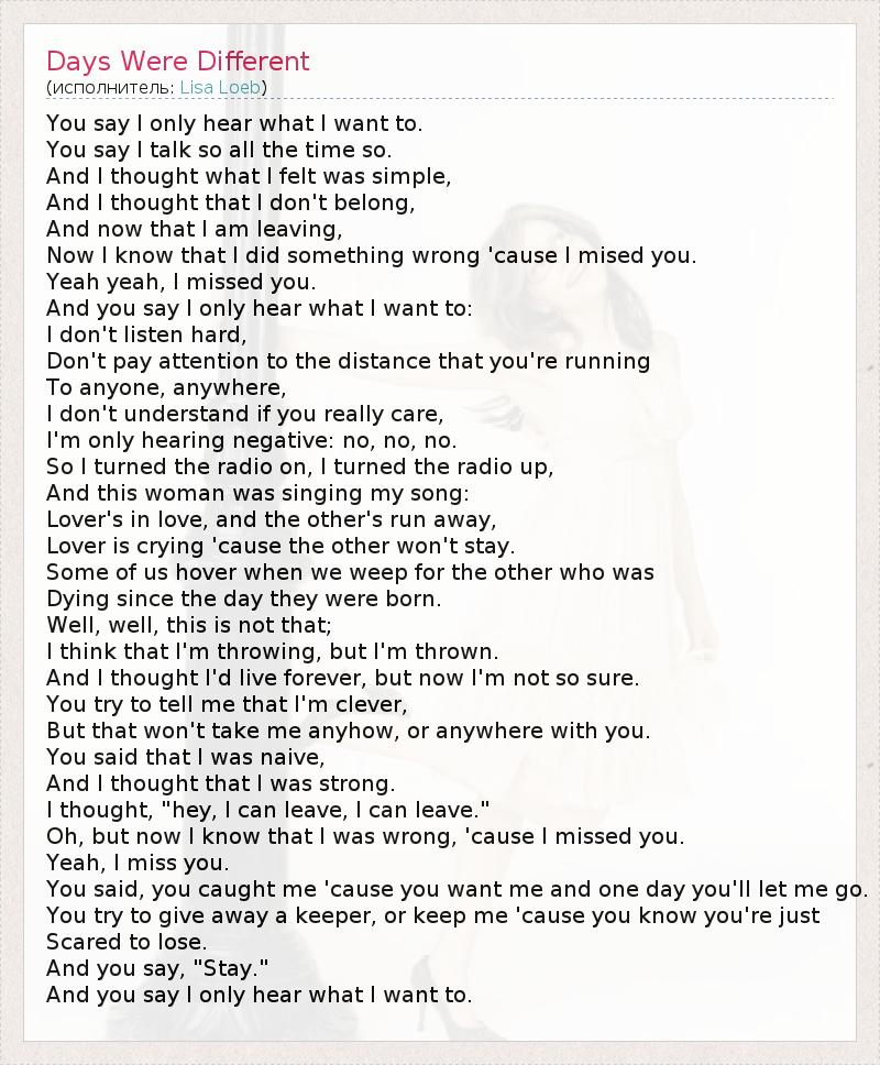 You say I only hear what I want to. You say I talk so all the time so. And I thought what I felt was simple, And I thought that I don't belong, And now that I am leaving, Now I know that I did something wrong 'cause I mised you. Yeah yeah, I missed you. And you say I only hear what I want to: I don't listen hard, Don't pay attention to the distance that you're running To anyone, anywhere, I don't understand if you really care, I'm only hearing negative: no, no, no. So I turned the radio on, I turned the radio up, And this woman was singing my song: Lover's in love, and the other's run away, Lover is crying 'cause the other won't stay. Some of us hover when we weep for the other who was Dying since the day they were born. Well, well, this is not that; I think that I'm throwing, but I'm thrown. And I thought I'd live forever, but now I'm not so sure. You try to tell me that I'm clever, But that won't take me anyhow, or anywhere with you. You said that I was naive, And I thought that I was strong. I thought, "hey, I can leave, I can leave." Oh, but now I know that I was wrong, 'cause I missed you. Yeah, I miss you. You said, you caught me 'cause you want me and one day you'll let me go. You try to give away a keeper, or keep me 'cause you know you're just Scared to lose. And you say, "Stay." And you say I only hear what I want to.