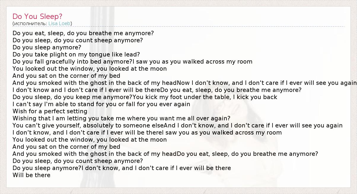 Do you eat, sleep, do you breathe me anymore? Do you sleep, do you count sheep anymore? Do you sleep anymore? Do you take plight on my tongue like lead? Do you fall gracefully into bed anymore?I saw you as you walked across my room You looked out the window, you looked at the moon And you sat on the corner of my bed And you smoked with the ghost in the back of my headNow I don't know, and I don't care if I ever will see you again I don't know and I don't care if I ever will be thereDo you eat, sleep, do you breathe me anymore? Do you sleep, do you keep me anymore?You kick my foot under the table, I kick you back I can't say I'm able to stand for you or fall for you ever again Wish for a perfect setting Wishing that I am letting you take me where you want me all over again? You can't give yourself, absolutely to someone elseAnd I don't know, and I don't care if I ever will see you again I don't know, and I don't care if I ever will be thereI saw you as you walked across my room You looked out the window, you looked at the moon And you sat on the corner of my bed And you smoked with the ghost in the back of my headDo you eat, sleep, do you breathe me anymore? Do you sleep, do you count sheep anymore? Do you sleep anymore?I don't know, and I don't care if I ever will be there Will be there