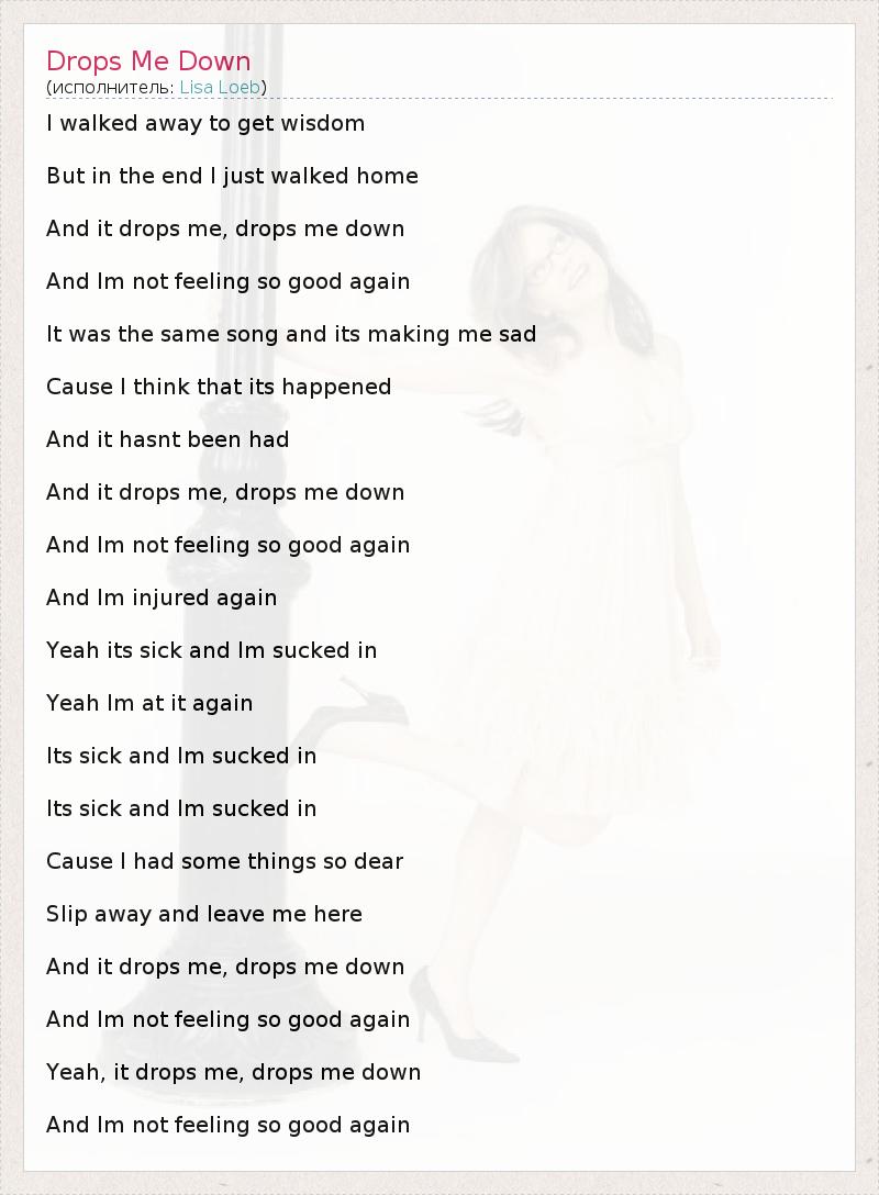 I walked away to get wisdom But in the end I just walked home And it drops me, drops me down And Im not feeling so good again It was the same song and its making me sad Cause I think that its happened And it hasnt been had And it drops me, drops me down And Im not feeling so good again And Im injured again Yeah its sick and Im sucked in Yeah Im at it again Its sick and Im sucked in Its sick and Im sucked in Cause I had some things so dear Slip away and leave me here And it drops me, drops me down And Im not feeling so good again Yeah, it drops me, drops me down And Im not feeling so good again