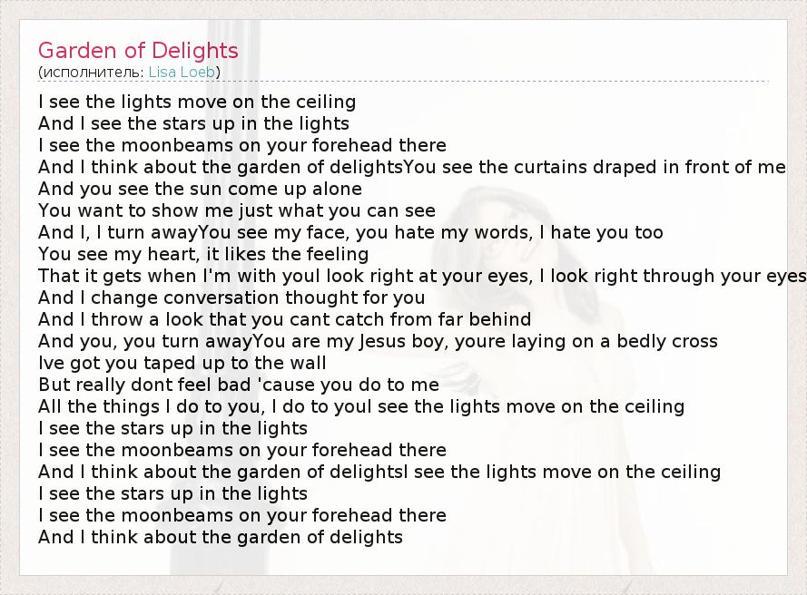 I see the lights move on the ceiling And I see the stars up in the lights I see the moonbeams on your forehead there And I think about the garden of delightsYou see the curtains draped in front of me And you see the sun come up alone You want to show me just what you can see And I, I turn awayYou see my face, you hate my words, I hate you too You see my heart, it likes the feeling That it gets when I'm with youI look right at your eyes, I look right through your eyes And I change conversation thought for you And I throw a look that you cant catch from far behind And you, you turn awayYou are my Jesus boy, youre laying on a bedly cross Ive got you taped up to the wall But really dont feel bad 'cause you do to me All the things I do to you, I do to youI see the lights move on the ceiling I see the stars up in the lights I see the moonbeams on your forehead there And I think about the garden of delightsI see the lights move on the ceiling I see the stars up in the lights I see the moonbeams on your forehead there And I think about the garden of delights