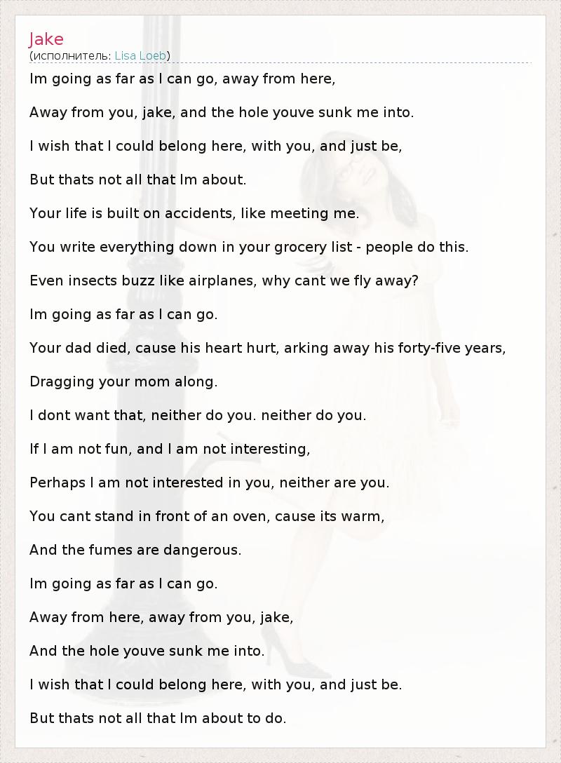 Im going as far as I can go, away from here, Away from you, jake, and the hole youve sunk me into. I wish that I could belong here, with you, and just be, But thats not all that Im about. Your life is built on accidents, like meeting me. You write everything down in your grocery list - people do this. Even insects buzz like airplanes, why cant we fly away? Im going as far as I can go. Your dad died, cause his heart hurt, arking away his forty-five years, Dragging your mom along. I dont want that, neither do you. neither do you. If I am not fun, and I am not interesting, Perhaps I am not interested in you, neither are you. You cant stand in front of an oven, cause its warm, And the fumes are dangerous. Im going as far as I can go. Away from here, away from you, jake, And the hole youve sunk me into. I wish that I could belong here, with you, and just be. But thats not all that Im about to do.