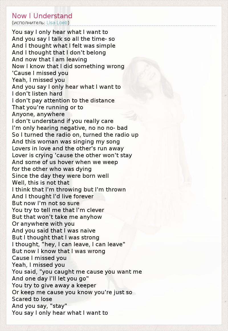 You say I only hear what I want to And you say I talk so all the time- so And I thought what I felt was simple And I thought that I don't belong And now that I am leaving Now I know that I did something wrong 'Cause I missed you Yeah, I missed you And you say I only hear what I want to I don't listen hard I don't pay attention to the distance That you're running or to Anyone, anywhere I don't understand if you really care I'm only hearing negative, no no no- bad So I turned the radio on, turned the radio up And this woman was singing my song Lovers in love and the other's run away Lover is crying 'cause the other won't stay And some of us hover when we weep for the other who was dying Since the day they were born well Well, this is not that I think that I'm throwing but I'm thrown And I thought I'd live forever But now I'm not so sure You try to tell me that I'm clever But that won't take me anyhow Or anywhere with you And you said that I was naive But I thought that I was strong I thought, "hey, I can leave, I can leave" But now I know that I was wrong Cause I missed you Yeah, I missed you You said, "you caught me cause you want me And one day I'll let you go" You try to give away a keeper Or keep me cause you know you're just so Scared to lose And you say, "stay" You say I only hear what I want to