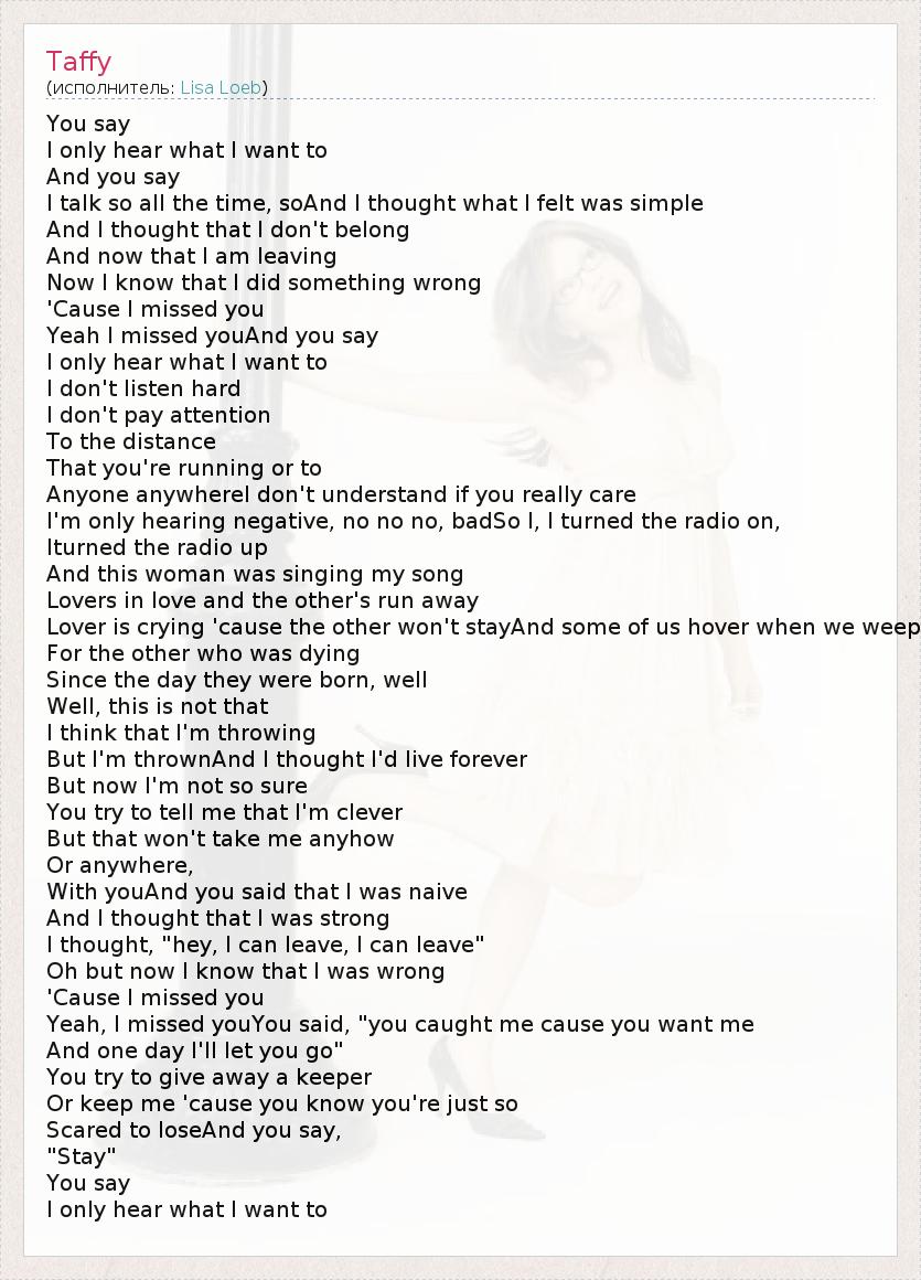 You say I only hear what I want to And you say I talk so all the time, soAnd I thought what I felt was simple And I thought that I don't belong And now that I am leaving Now I know that I did something wrong 'Cause I missed you Yeah I missed youAnd you say I only hear what I want to I don't listen hard I don't pay attention To the distance That you're running or to Anyone anywhereI don't understand if you really care I'm only hearing negative, no no no, badSo I, I turned the radio on, Iturned the radio up And this woman was singing my song Lovers in love and the other's run away Lover is crying 'cause the other won't stayAnd some of us hover when we weep For the other who was dying Since the day they were born, well Well, this is not that I think that I'm throwing But I'm thrownAnd I thought I'd live forever But now I'm not so sure You try to tell me that I'm clever But that won't take me anyhow Or anywhere, With youAnd you said that I was naive And I thought that I was strong I thought, "hey, I can leave, I can leave" Oh but now I know that I was wrong 'Cause I missed you Yeah, I missed youYou said, "you caught me cause you want me And one day I'll let you go" You try to give away a keeper Or keep me 'cause you know you're just so Scared to loseAnd you say, "Stay" You say I only hear what I want to