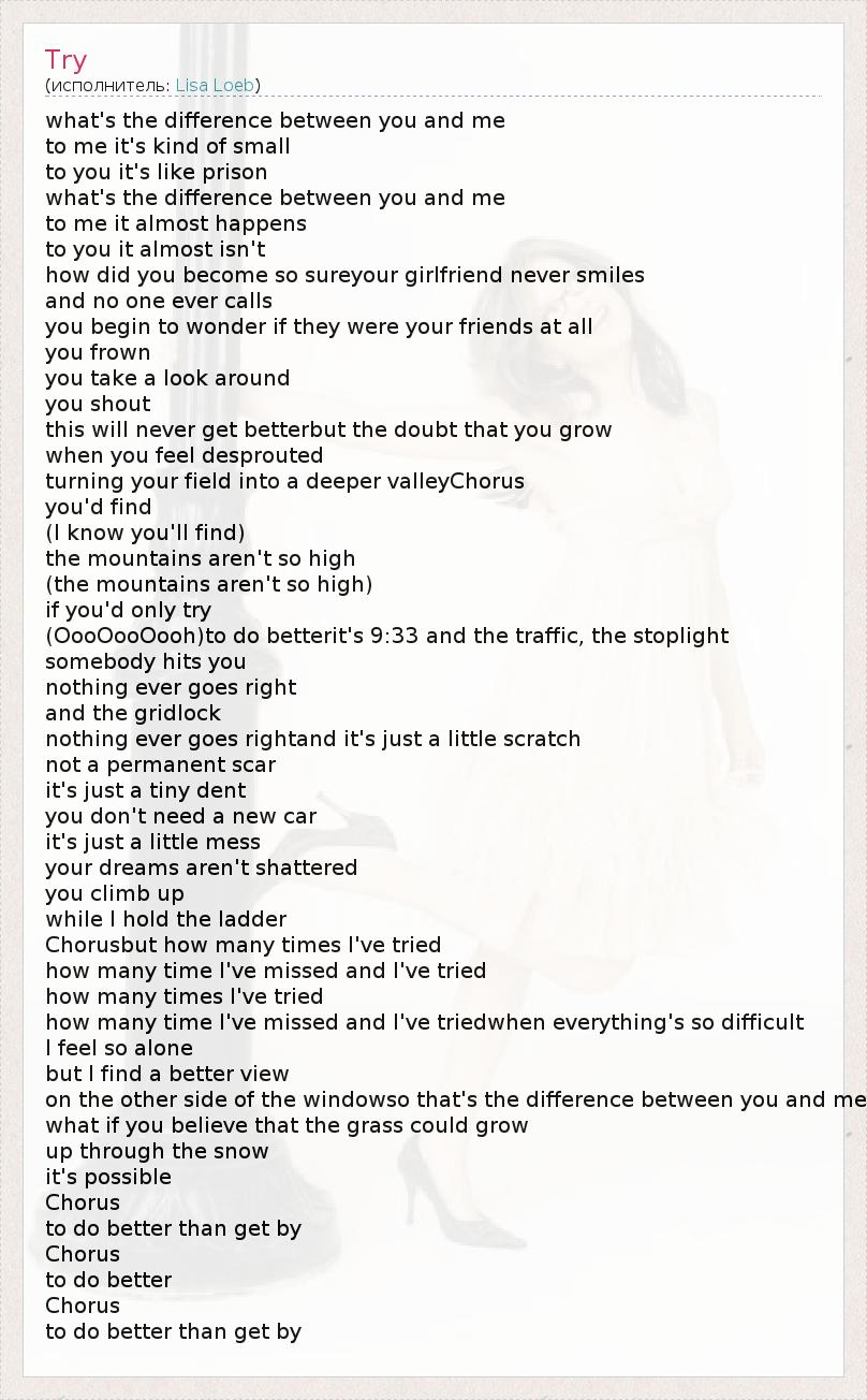 what's the difference between you and me to me it's kind of small to you it's like prison what's the difference between you and me to me it almost happens to you it almost isn't how did you become so sureyour girlfriend never smiles and no one ever calls you begin to wonder if they were your friends at all you frown you take a look around you shout this will never get betterbut the doubt that you grow when you feel desprouted turning your field into a deeper valleyChorus you'd find (I know you'll find) the mountains aren't so high (the mountains aren't so high) if you'd only try (OooOooOooh)to do betterit's 9:33 and the traffic, the stoplight somebody hits you nothing ever goes right and the gridlock nothing ever goes rightand it's just a little scratch not a permanent scar it's just a tiny dent you don't need a new car it's just a little mess your dreams aren't shattered you climb up while I hold the ladder Chorusbut how many times I've tried how many time I've missed and I've tried how many times I've tried how many time I've missed and I've triedwhen everything's so difficult I feel so alone but I find a better view on the other side of the windowso that's the difference between you and me what if you believe that the grass could grow up through the snow it's possible Chorus to do better than get by Chorus to do better Chorus to do better than get by