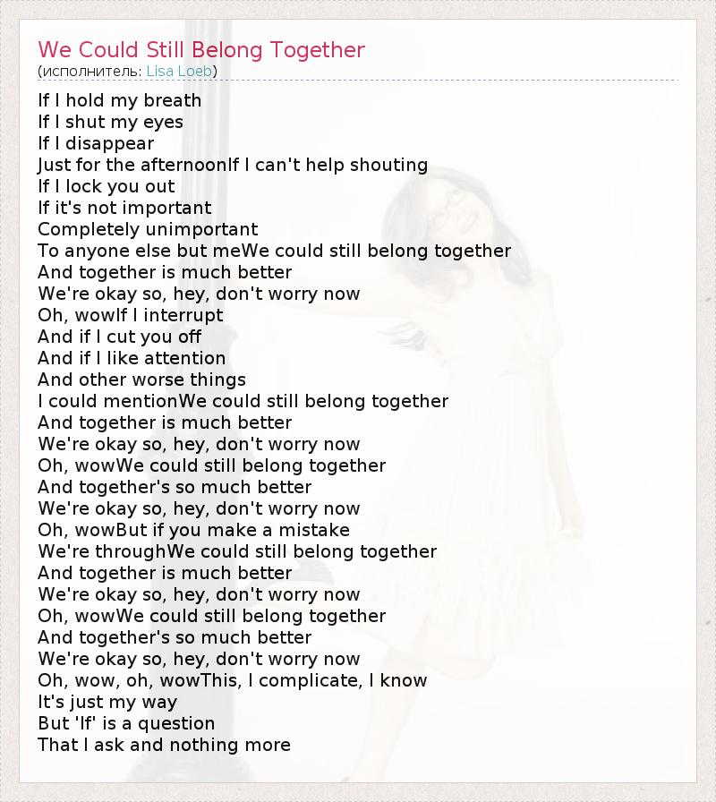 If I hold my breath If I shut my eyes If I disappear Just for the afternoonIf I can't help shouting If I lock you out If it's not important Completely unimportant To anyone else but meWe could still belong together And together is much better We're okay so, hey, don't worry now Oh, wowIf I interrupt And if I cut you off And if I like attention And other worse things I could mentionWe could still belong together And together is much better We're okay so, hey, don't worry now Oh, wowWe could still belong together And together's so much better We're okay so, hey, don't worry now Oh, wowBut if you make a mistake We're throughWe could still belong together And together is much better We're okay so, hey, don't worry now Oh, wowWe could still belong together And together's so much better We're okay so, hey, don't worry now Oh, wow, oh, wowThis, I complicate, I know It's just my way But 'If' is a question That I ask and nothing more