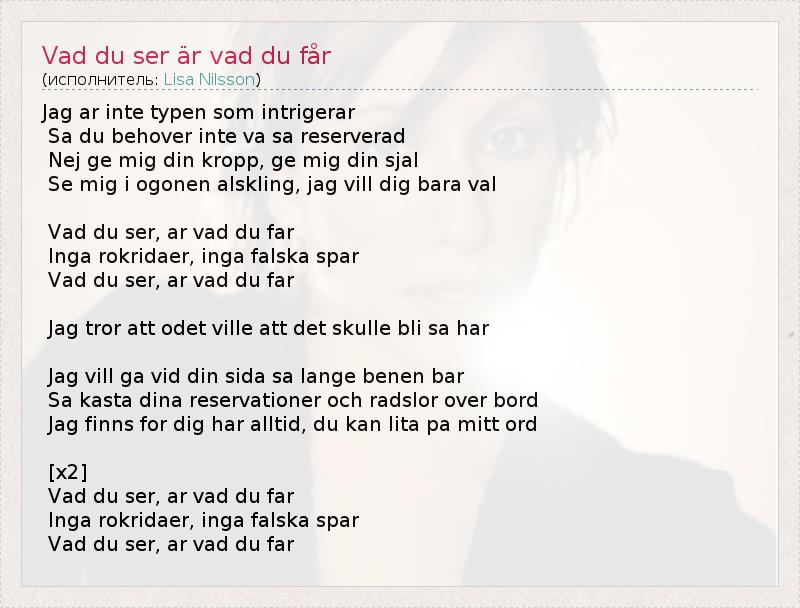ГлавнаяИсполнителиLisa NilssonVad du ser är vad du får