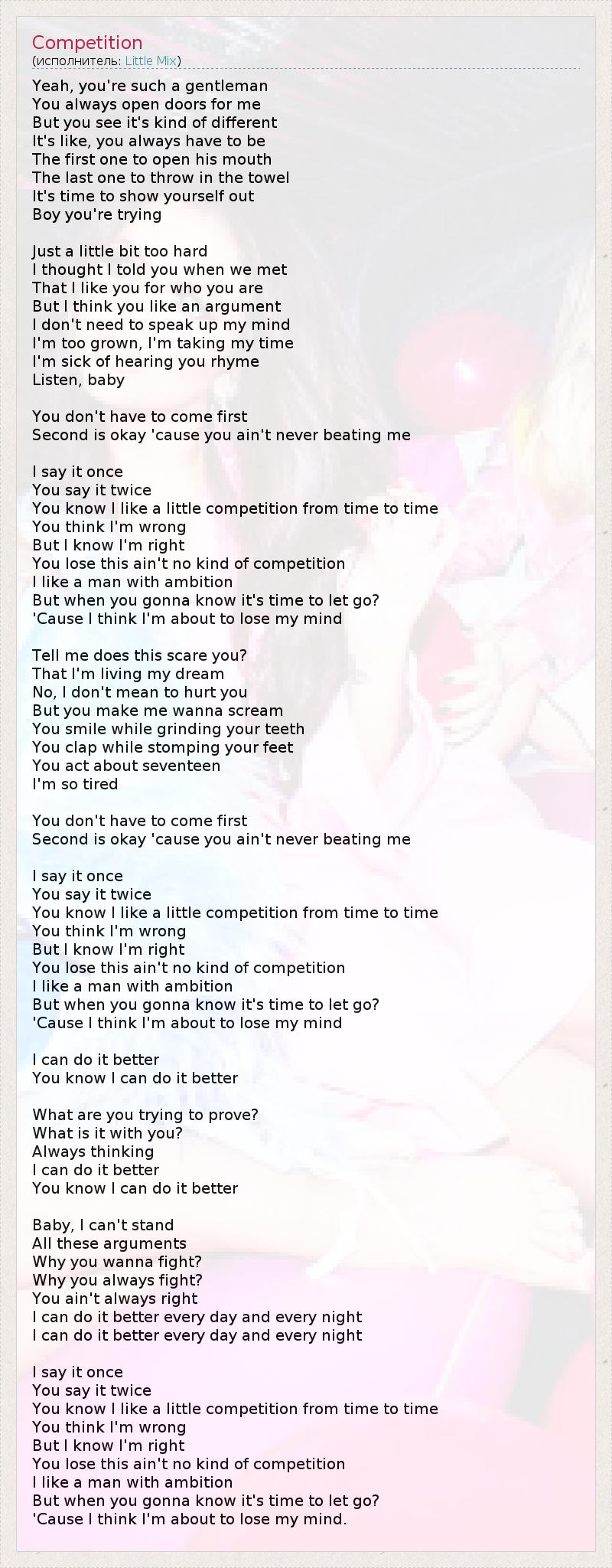 Yeah, you're such a gentleman You always open doors for me But you see it's kind of different It's like, you always have to be The first one to open his mouth The last one to throw in the towel It's time to show yourself out Boy you're trying Just a little bit too hard I thought I told you when we met That I like you for who you are But I think you like an argument I don't need to speak up my mind I'm too grown, I'm taking my time I'm sick of hearing you rhyme Listen, baby You don't have to come first Second is okay 'cause you ain't never beating me I say it once You say it twice You know I like a little competition from time to time You think I'm wrong But I know I'm right You lose this ain't no kind of competition I like a man with ambition But when you gonna know it's time to let go? 'Cause I think I'm about to lose my mind Tell me does this scare you? That I'm living my dream No, I don't mean to hurt you But you make me wanna scream You smile while grinding your teeth You clap while stomping your feet You act about seventeen I'm so tired You don't have to come first Second is okay 'cause you ain't never beating me I say it once You say it twice You know I like a little competition from time to time You think I'm wrong But I know I'm right You lose this ain't no kind of competition I like a man with ambition But when you gonna know it's time to let go? 'Cause I think I'm about to lose my mind I can do it better You know I can do it better What are you trying to prove? What is it with you? Always thinking I can do it better You know I can do it better Baby, I can't stand All these arguments Why you wanna fight? Why you always fight? You ain't always right I can do it better every day and every night I can do it better every day and every night I say it once You say it twice You know I like a little competition from time to time You think I'm wrong But I know I'm right You lose this ain't no kind of competition I like a man with ambition But when you gonna know it's time to let go? 'Cause I think I'm about to lose my mind.