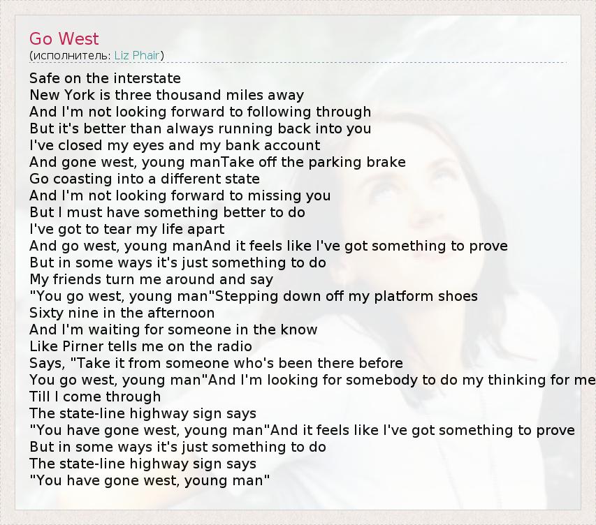 You go west, young man"And I'm looking for somebody to do my thinking for me