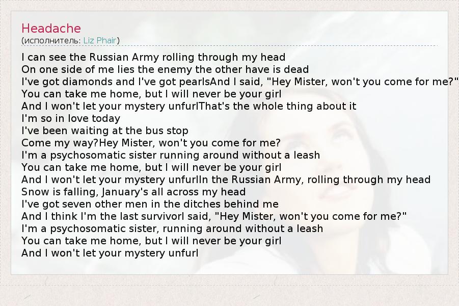 And I won't let your mystery unfurlIn the Russian Army, rolling through my head