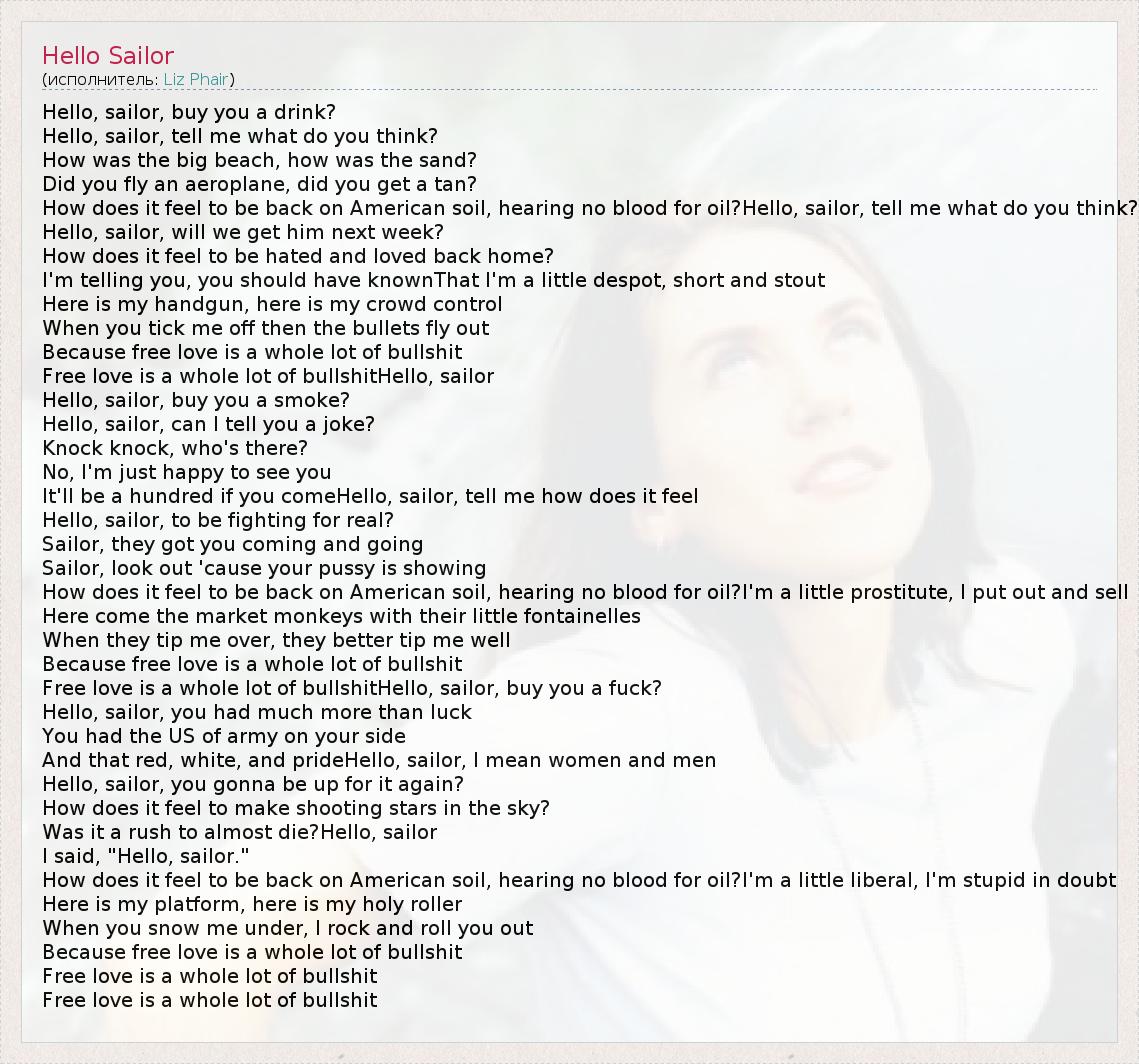 Hello, sailor, buy you a drink? Hello, sailor, tell me what do you think? How was the big beach, how was the sand? Did you fly an aeroplane, did you get a tan? How does it feel to be back on American soil, hearing no blood for oil?Hello, sailor, tell me what do you think? Hello, sailor, will we get him next week? How does it feel to be hated and loved back home? I'm telling you, you should have knownThat I'm a little despot, short and stout Here is my handgun, here is my crowd control When you tick me off then the bullets fly out Because free love is a whole lot of bullshit Free love is a whole lot of bullshitHello, sailor Hello, sailor, buy you a smoke? Hello, sailor, can I tell you a joke? Knock knock, who's there? No, I'm just happy to see you It'll be a hundred if you comeHello, sailor, tell me how does it feel Hello, sailor, to be fighting for real? Sailor, they got you coming and going Sailor, look out 'cause your pussy is showing How does it feel to be back on American soil, hearing no blood for oil?I'm a little prostitute, I put out and sell Here come the market monkeys with their little fontainelles When they tip me over, they better tip me well Because free love is a whole lot of bullshit Free love is a whole lot of bullshitHello, sailor, buy you a fuck? Hello, sailor, you had much more than luck You had the US of army on your side And that red, white, and prideHello, sailor, I mean women and men Hello, sailor, you gonna be up for it again? How does it feel to make shooting stars in the sky? Was it a rush to almost die?Hello, sailor I said, "Hello, sailor." How does it feel to be back on American soil, hearing no blood for oil?I'm a little liberal, I'm stupid in doubt Here is my platform, here is my holy roller When you snow me under, I rock and roll you out Because free love is a whole lot of bullshit Free love is a whole lot of bullshit Free love is a whole lot of bullshit